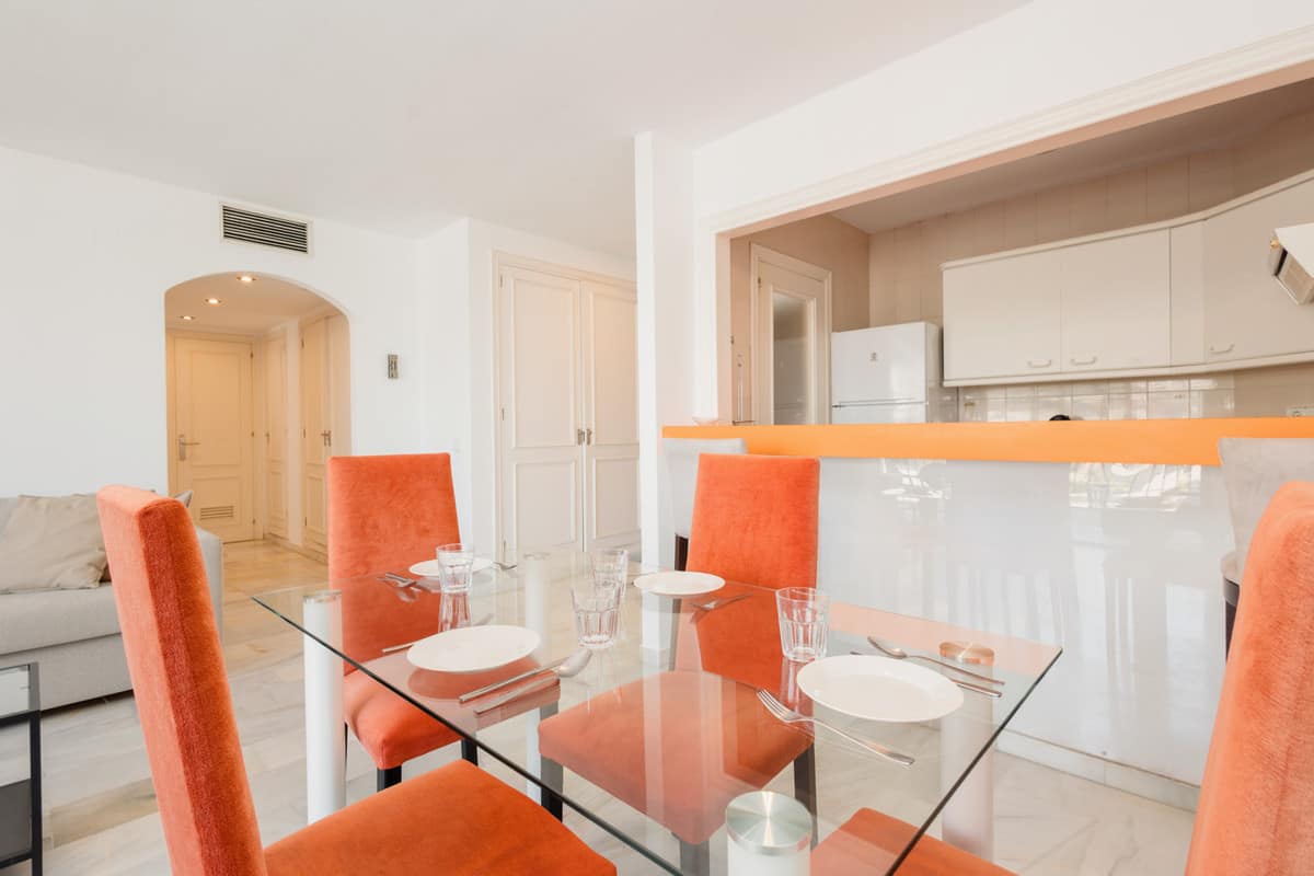This 101m² apartment is located in one of the most exclusive areas of Marbella, ideal for 4 people. Just steps from the beach and marina, it features two bedrooms, a spacious living-dining room, a fully equipped American-style kitchen, and a private terrace with views of the mountains and the urban heart of Puerto Banús. Its privileged location makes it the perfect choice for an unforgettable vacation.