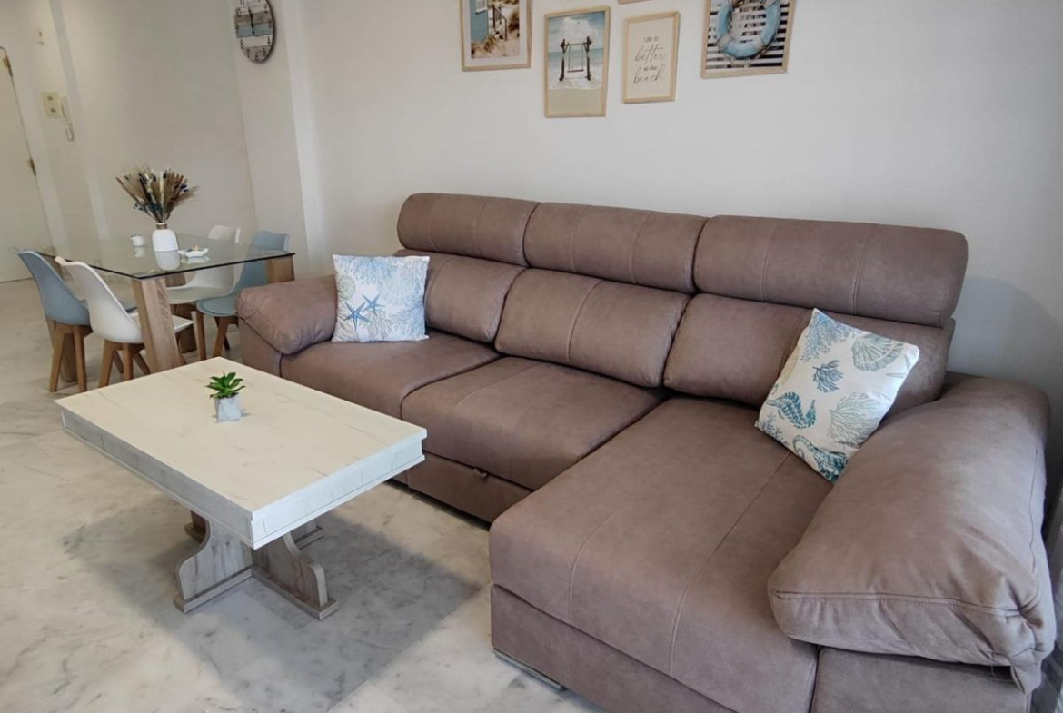With 110 m² of living space, this bright home features 2 spacious bedrooms with built-in wardrobes, 2 full bathrooms (one en suite), a fully equipped kitchen, and a bright living-dining room with direct access to a private terrace boasting sea and garden views. The perfect setting to relax and enjoy the Mediterranean climate.
