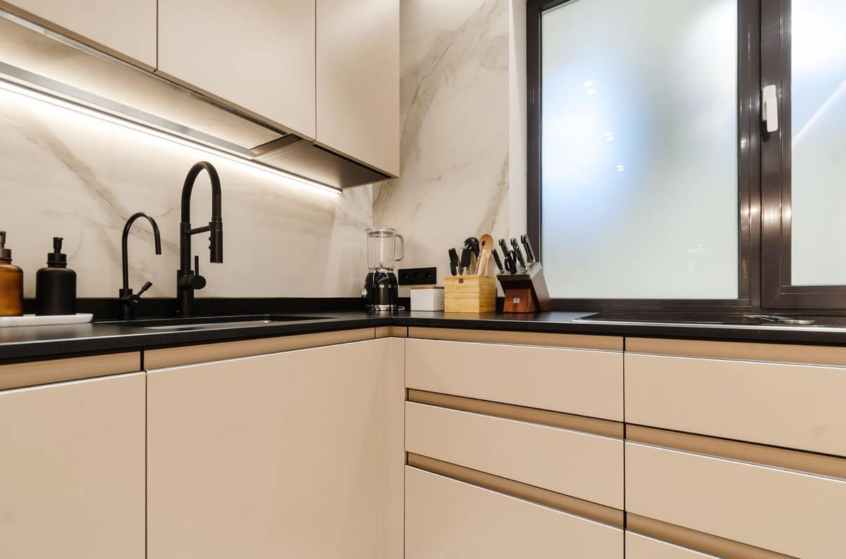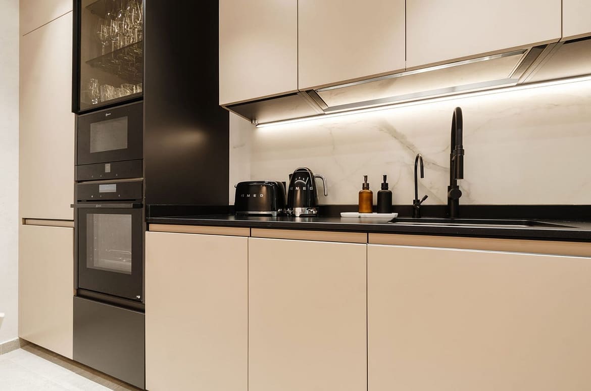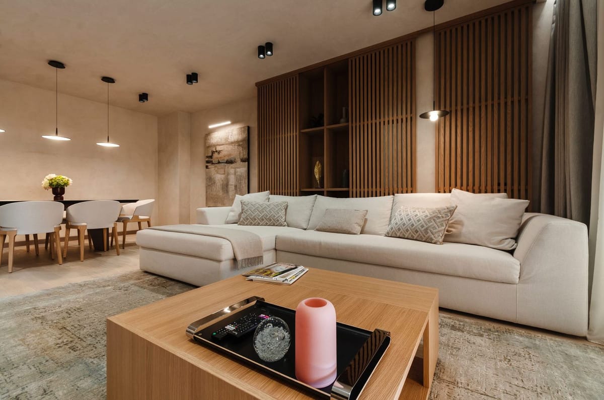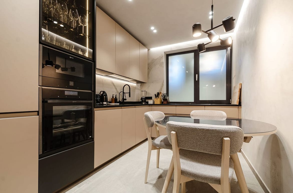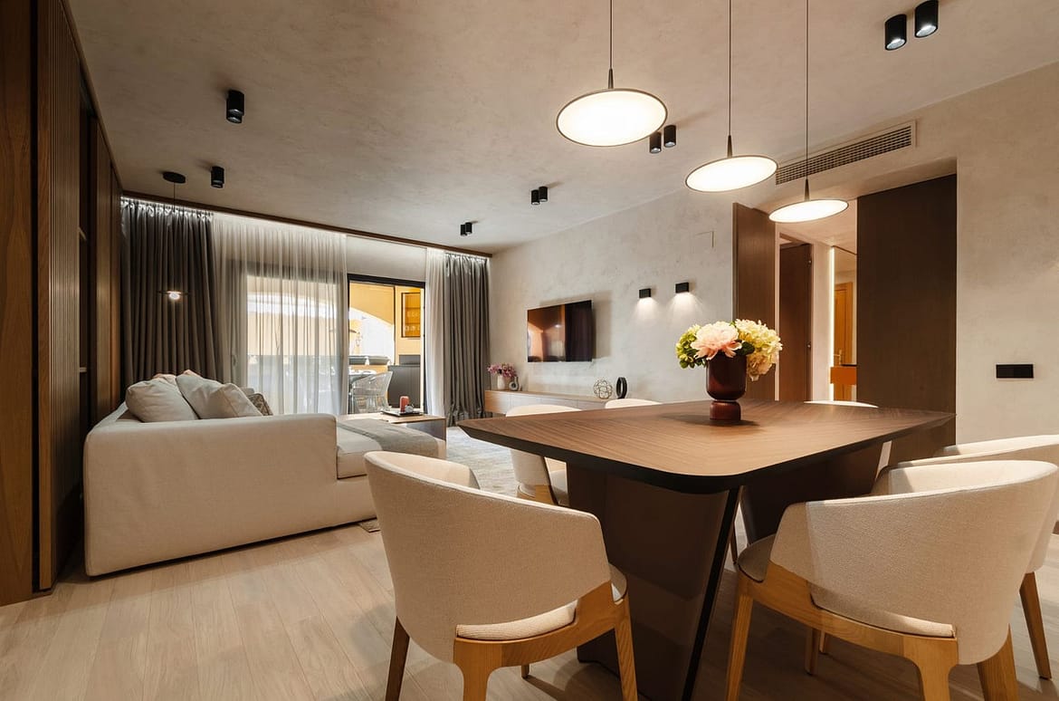 The apartment features a bright open-plan living and dining area with contemporary furnishings, natural wood details, and large windows that fill the space with natural light. The fully equipped modern kitchen includes high-quality appliances and everything needed for both short and extended stays.