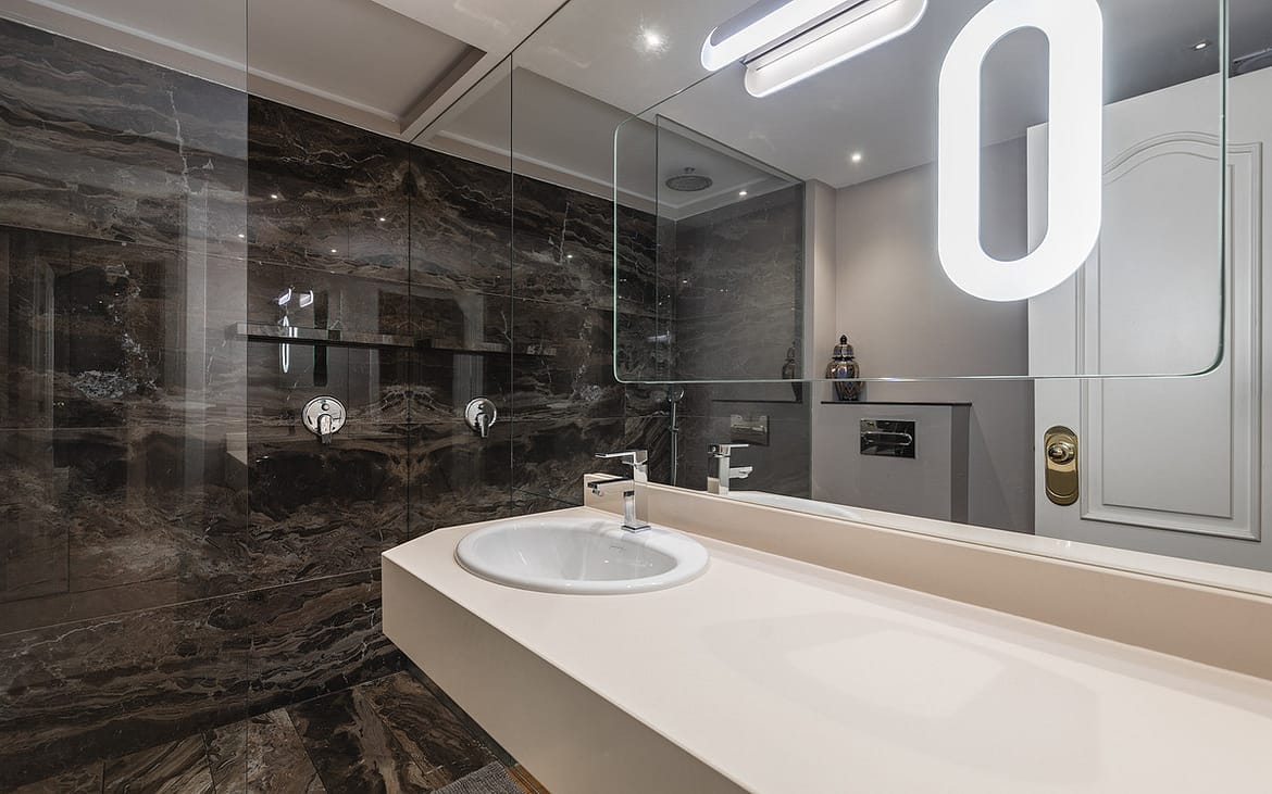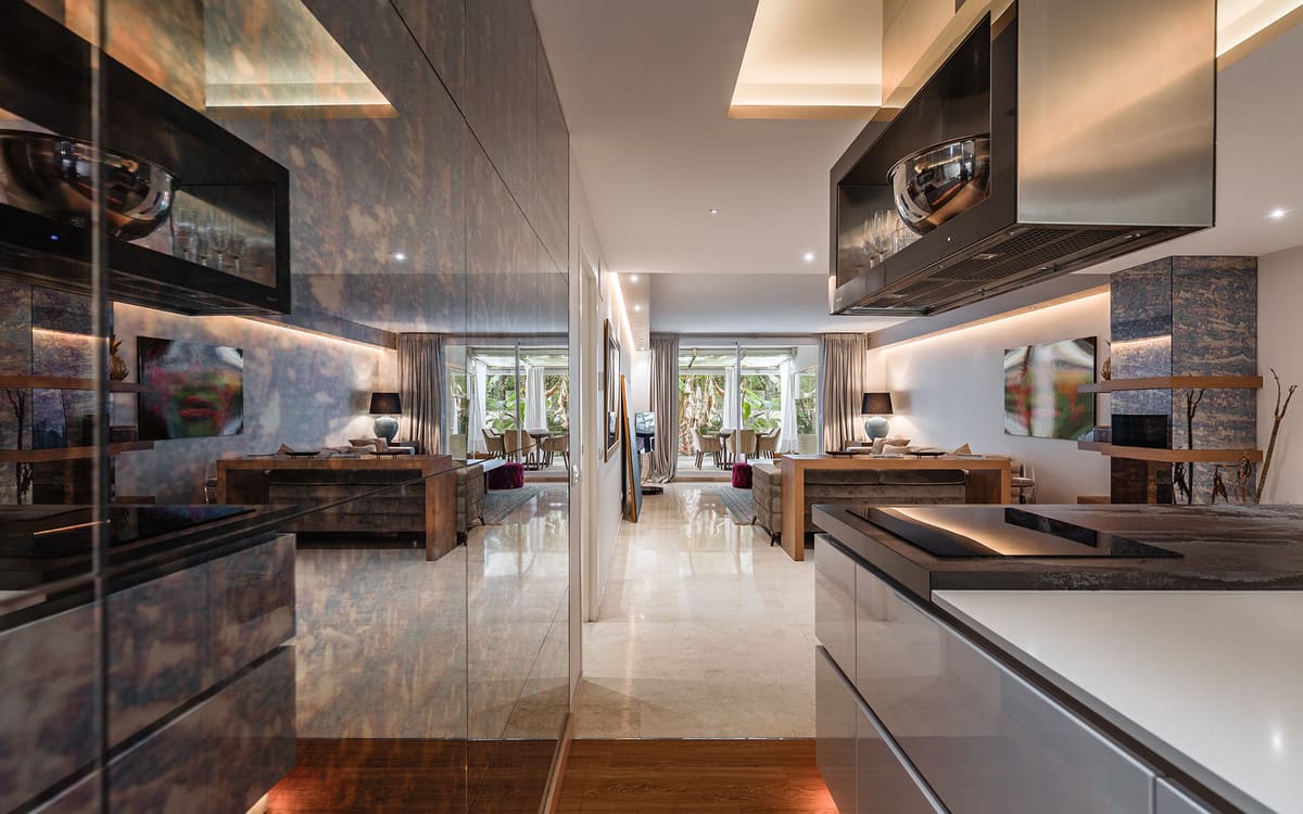 Exquisitely presented ground-floor apartment located in a 24-hour secured complex in Las Lomas del Marbella Club, in the heart of the Golden Mile. The property has been completely renovated and makes incredible use of the open floor plan that blends the kitchen, living room and large outdoor terrace seamlessly. Large floor-to-ceiling windows open up from the living room to a lush tropical garden and covered terrace with adjustable glass curtains that can be opened in the summer months to provide an incredible entertaining space within a very private setting. The apartment makes the most of the square meters and provides two spacious bedrooms, each with their own en-suite bathroom. The master bedroom opens up and connects with the large terrace towards the back of the unit. The complex offers an outdoor pool with wonderful sea views, gym and sauna for residents. The property comes with 1 parking space and a large storage room. Situated in a sought-after area, approximately half-way between Marbella Town and Puerto Banús.