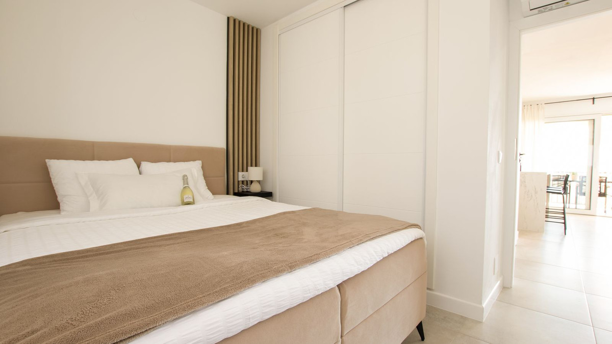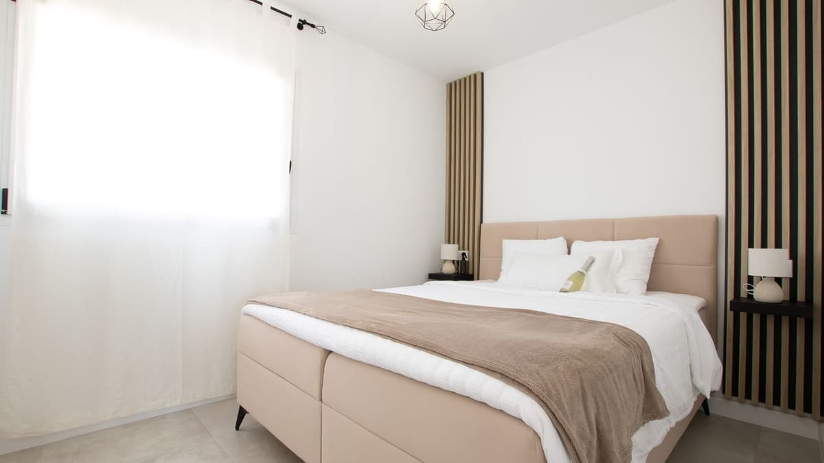 Stunning new property on the market, located in Torrenueva Mijas Costa, 5 min walking distance from La Cala de Mijas city and only a 1-2 minutes walk through the community and through the private communal tunel to reach the beach. This amazing unit, has a bright and light scandianvian style decoration and comes with 2 exterior bedrooms and 2 full bathrooms, open plan and fully equipped kitchen with a large island and many many windows in the living room and the kitchen for amazing sea views from all the corners of the property. The kitchen has a washing and drying machine, dishwasher, microwave, fridge, oven, hob, toaster and full set of cutlery and crockery. From the terrace except from the sea views, you can spot Torrenueva’s tower and large communal pool. This property is completely new, 100% refurbished by our team and it is now available for rentals. In the bathrooms there are modern walk-in showers, and suspended toilets of modern minimalistic design. The living room is spacious and bright and on the sofa bed can sleep 2. There is an electrical chimney and smart TV and of course unlimited internet. In the summer months it is available for vacational rental and in the winter months it can be as well rented for a few months, with a monthly price of 2800 Eur per month from October until March. Contact us for more information regarding this unit in lower Torrenueva, Mijas Costa. This community has a private exit to the beach, just next to the restaurant el Oceano that is frontline beach, and once on the beach you can walk 5 minutes to the center of La Cala de Mijas city with so many amenities. In Torrenueva, as well walking distance from the apartment, at the bottom end of the same street there are a few bars, restaurants and a supermarket. We speak more than 10 languages, contact us for more information on this unit, in the same community just next door we have another newly refurbished unit with max capacity of 6 people sleeping as well so if you are a large group of friends and / por family you can be door to door for extra comfortable vacations.