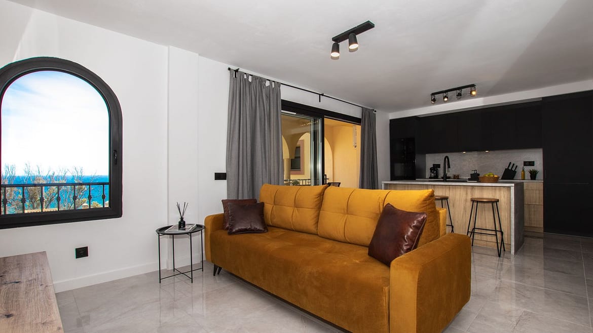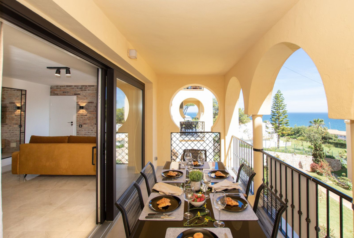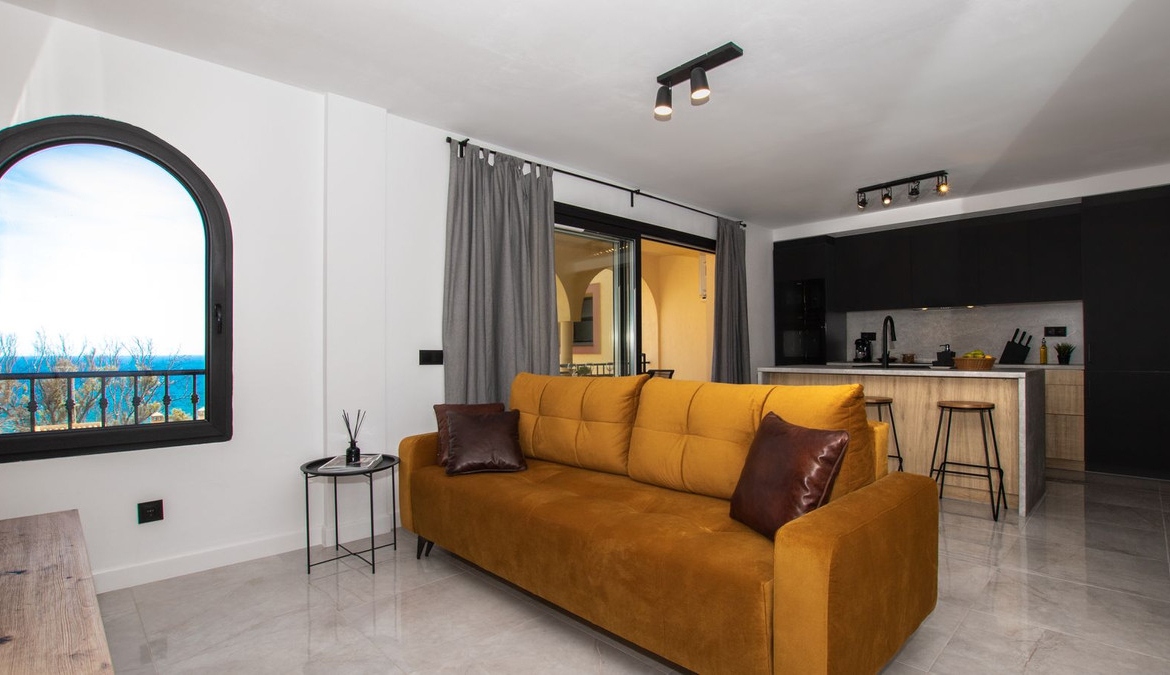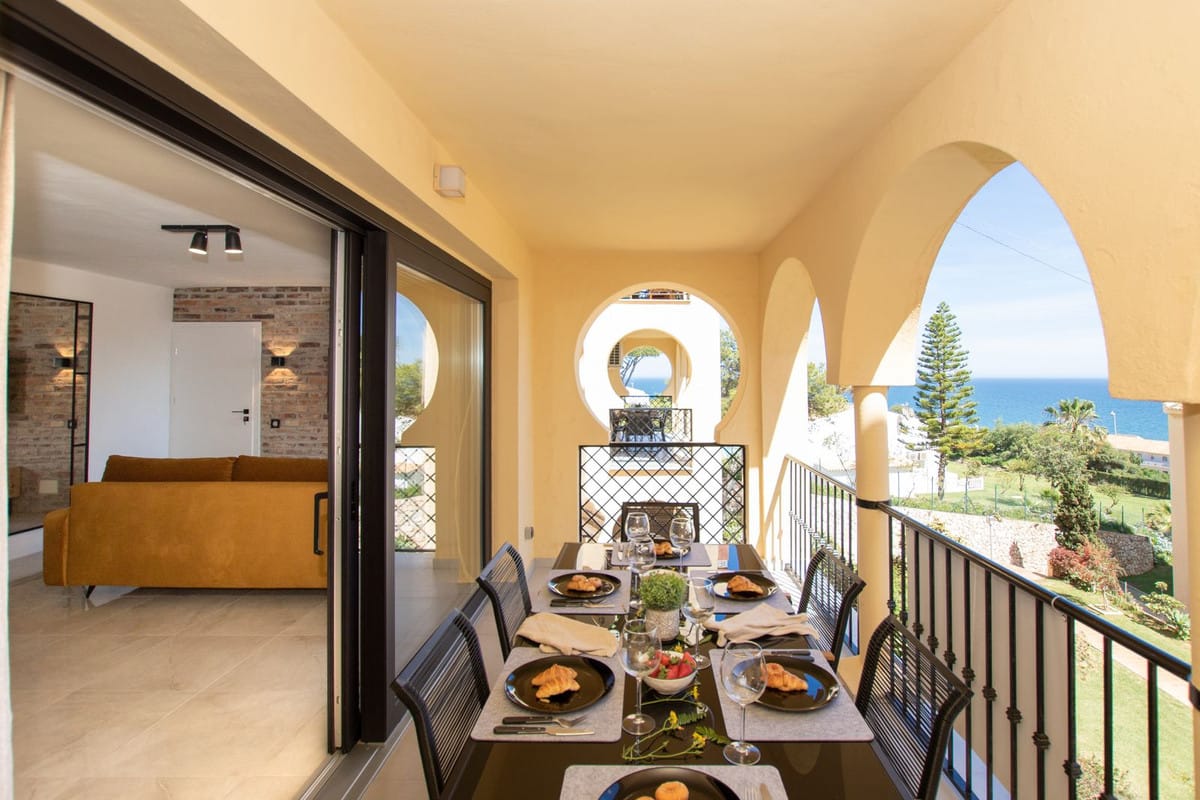 This amazing unit, has a well thought loft (New Yorkish) style decoration and comes with 2 exterior bedrooms and 2 full bathrooms, open plan and fully equipped kitchen with a large island and many windows in the living room and the kitchen for amazing sea views from all the corners of the property. The kitchen has a washing and drying machine, dishwasher, microwave, fridge, oven, hob, toaster and full set of cutlery and crockery. From the terrace there are beautiful panoramic sea views and a large dinning table with 6 cozy chairs. This property is completely new, 100% refurbished by our team and it is now available for rentals. In the bathrooms there are modern walk-in showers, and suspended toilets of modern minimalistic design. The living room is spacious and bright and on the sofa bed inh the living room can sleep 2 people. There is a smart TV and of course unlimited internet. In the summer months it is available for vacational rental and in the winter months it can be as well rented for a few months, with a monthly price of 1850 Eur per month from October until March. Also in winter months, apart from the rental price the tenants need to pay for utilities (water, internet and electricity). Contact us for more information regarding this unit in lower Torrenueva, Mijas Costa. This community has a private exit to the beach, just next to the restaurant el Oceano that is frontline beach, and once on the beach you can walk 5 minutes to the center of La Cala de Mijas city with so many amenities. In Torrenueva, as well walking distance from the apartment, at the bottom end of the same street there are a few bars, restaurants and a supermarket. In this gated community there is alarge communal pool and a small pool for kids. We speak more than 10 languages, contact us for more information on this unit, in the same community just next door we have another newly refurbished unit with max capacity of 6 people sleeping as well so if you are a large group of friends and / or family you can be door to door for extra comfortable vacations.