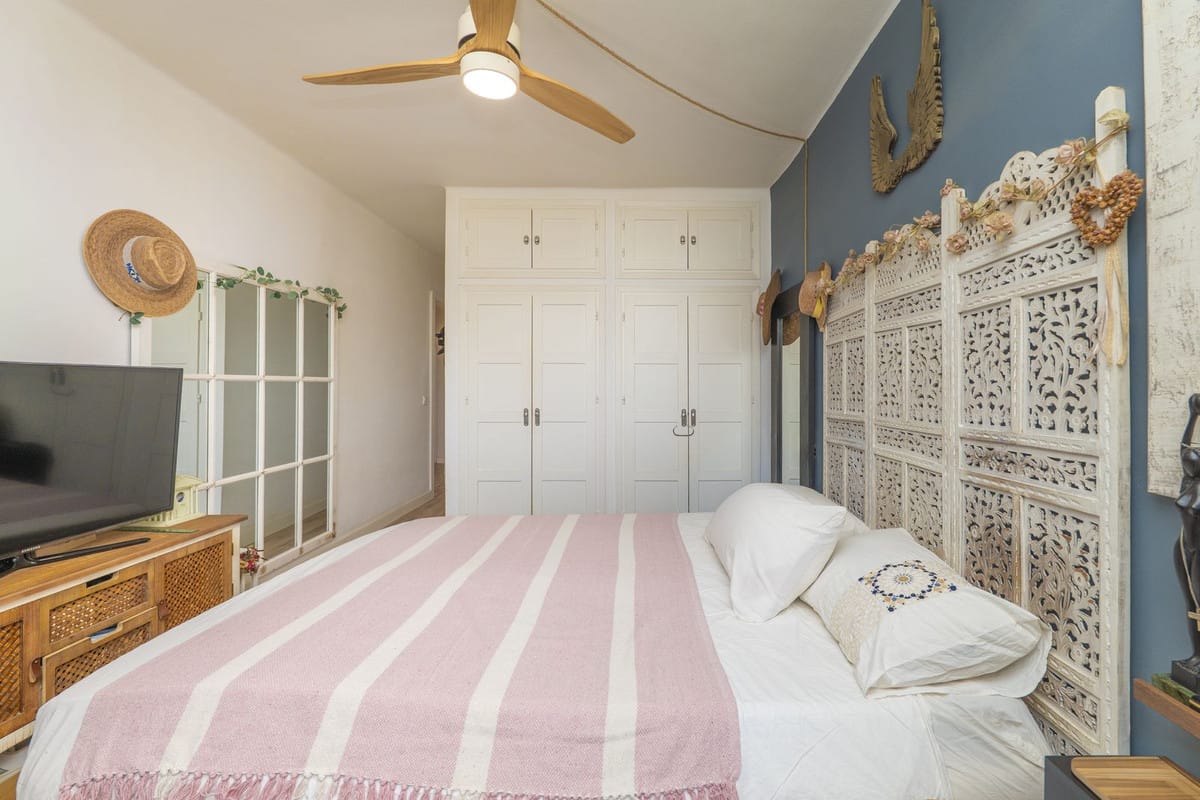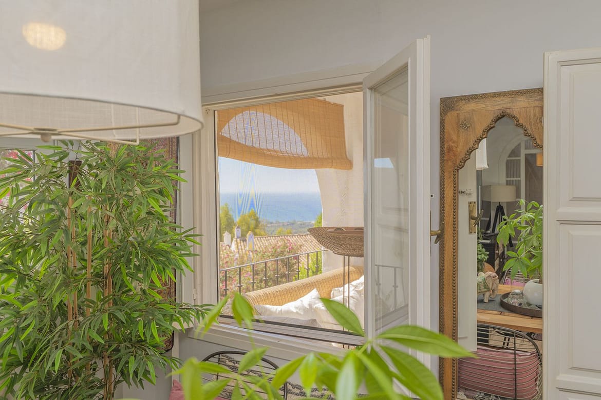 Charming two bedroom and two bathroom apartment boasting awesome sea views from its South facing beautiful terrace. Nestled in an Andalusian style urbanization with an enviable location at Las Lomas de Los Monteros, hence its stunning sea and coastal views and even the African littoral. This complex of whitewashed homes of a delightful rustic style comprises manicured gardens and a pool area with the mentioned jaw dropping views. The dwelling welcomes you with a distributor hall with the kitchen at the right followed by a complete bathroom; on the left side we find one bedroom, followed by the main bedroom with bathroom en suite. Continuing along the hall we reach the bright, as the whole property, living room with a distinguishable dining area and access to the cosy covered terrace and its enchanting views to the Marbella coast. A stylish home properly improved along the years with evidences of the improvements such as cladding, flooring, reformed bathrooms, fully fitted and equipped kitchen with first line appliances, A/C hot and cold, besides, an underground storage-cellar amounting 28sqm … a wise first dwelling option or holiday home, surrounded by nature and forests oozing discretion, privacy and tranquility as its main features … Come and check for yourself and you won't regret when you breathe and check the quiet oasis in which the property is located.