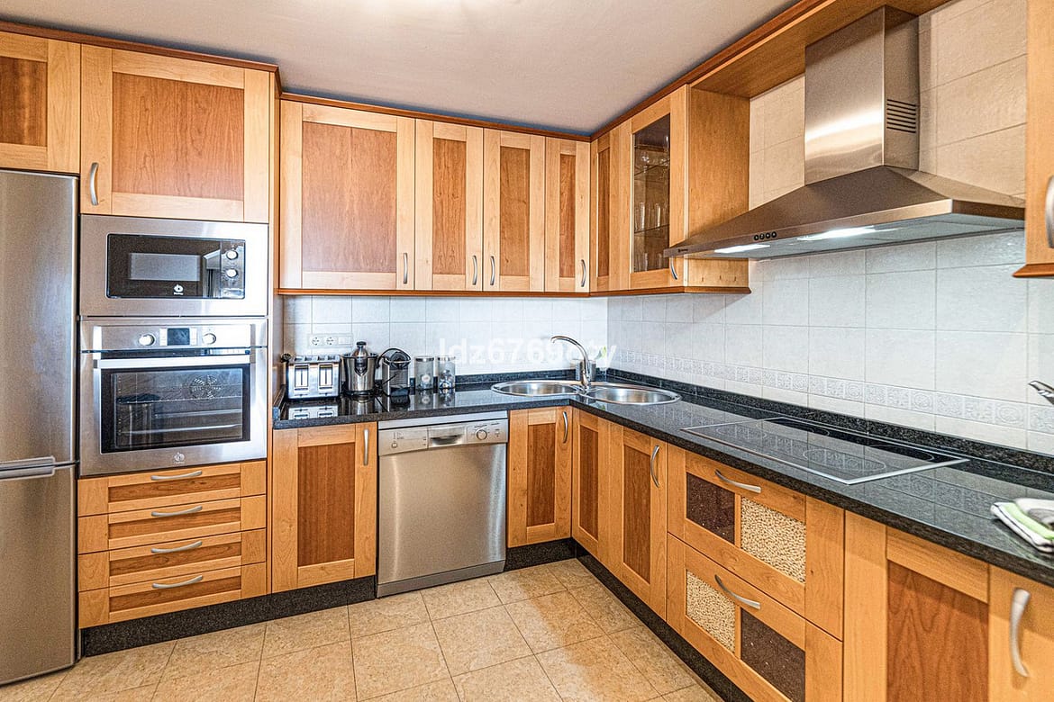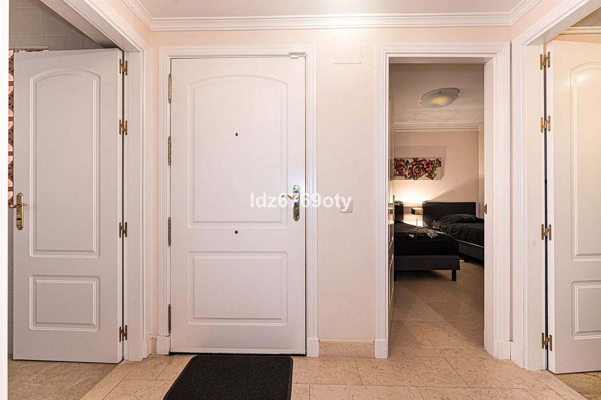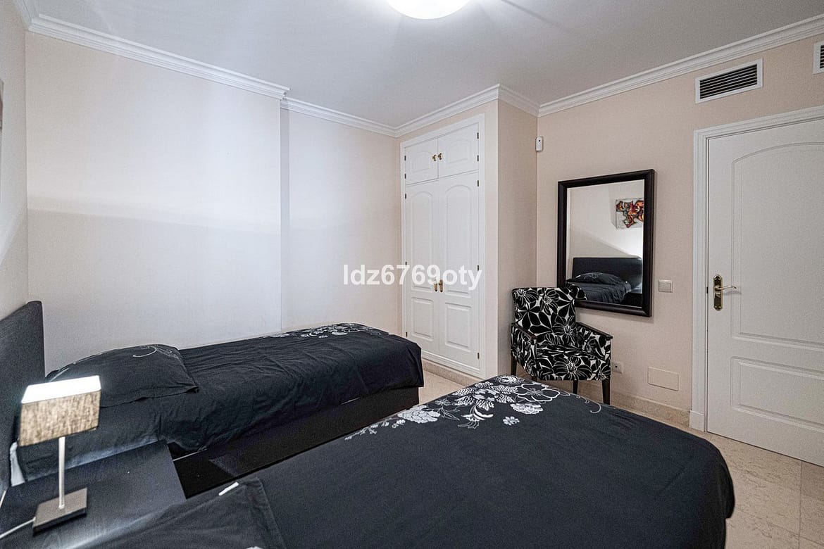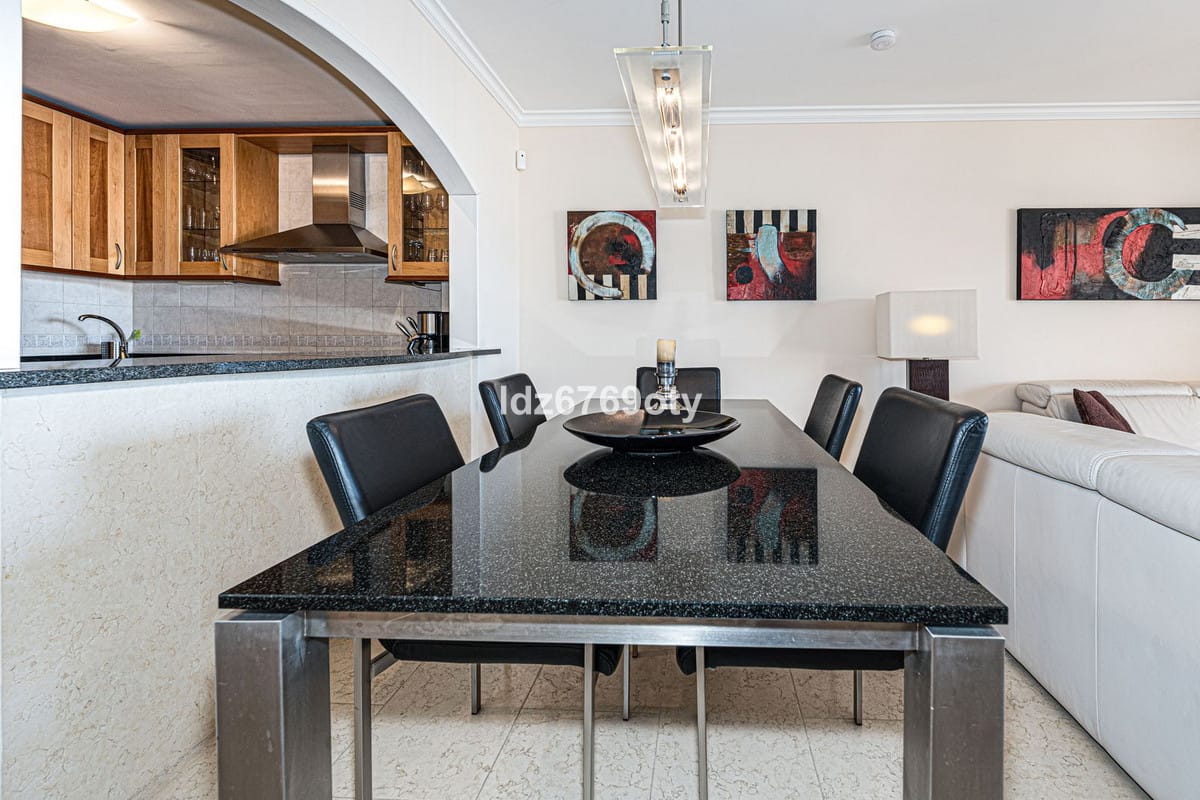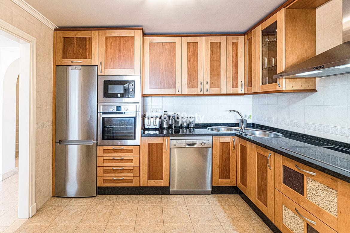 The 2-bedroom apartment, which is in excellent condition and has a living area of 90m2, faces South-West and is located on the 1st floor, which is accessible by lift from the indoor garage. The neutrally decorated apartment is fully furnished, equipped with air conditioning/heating and also has fast WiFi. The open and spacious kitchen offers various built-in appliances, including a dishwasher, oven, microwave, fridge/freezer and a ceramic hob. The dining/living room provides direct access to the spacious 25 m² terrace with seaviews and space for both sun loungers and a dining area for six people. The spacious master bedroom has built-in wardrobes, a television and direct access to the terrace. The en-suite bathroom has a Jacuzzi, shower, double sinks and a toilet. The second bedroom has built-in wardrobes and uses a separate second bathroom with a shower. The apartment also has a laundry room with a washing machine and dryer. The underground car park also has a private storage room and a parking space.