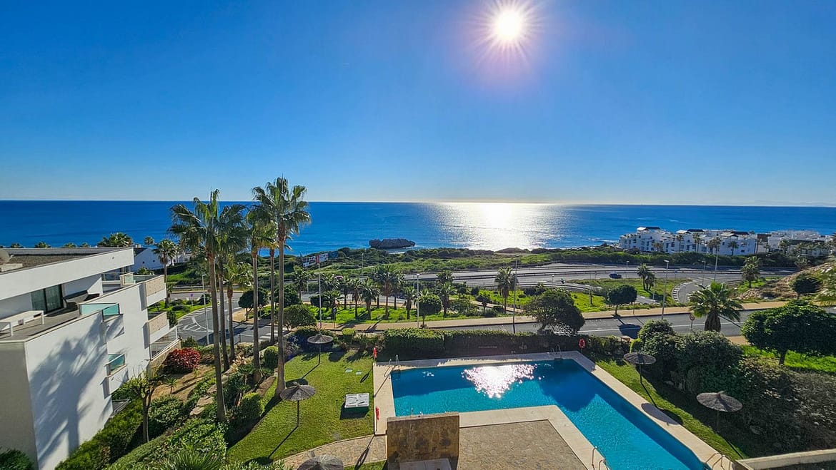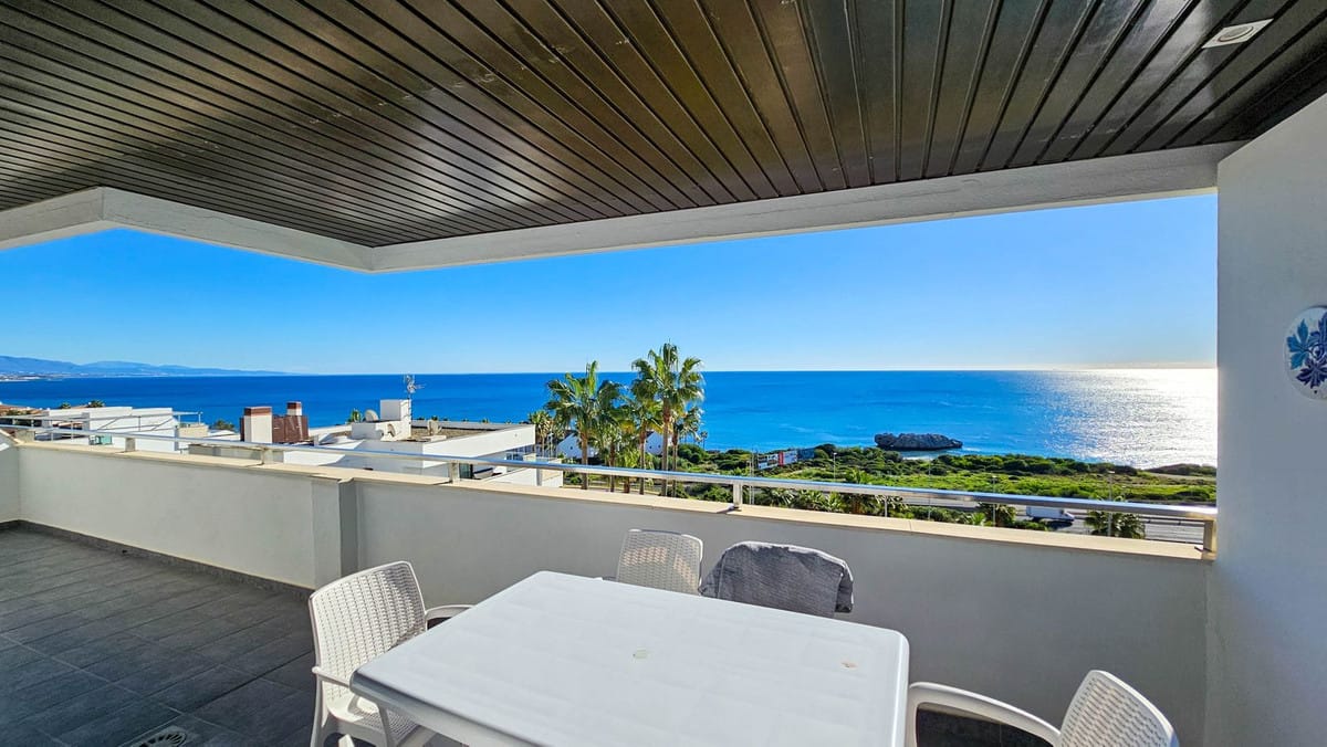 Stunning sea views in this 2 bedroom, 2 bathroom beachfront apartment in this development with communal gardens, paddle tennis court and swimming pool. This spectacular apartment has its entrance on the ground floor, although it is an intermediate floor due to the elevation of the land facing the sea. It is distributed as follows: spacious and bright living-dining room through the large window with beautiful sea views and direct access to the incredible 55m2 terrace with covered and uncovered areas, perfect for dining outdoors all year round. The kitchen is independent, L-shaped, has a granite kitchen counter and modern, high-quality furniture, and has a space for laundry and other utilities. The master bedroom is large and has an en-suite bathroom with a bathtub, a large built-in wardrobe and direct access to the terrace. In addition, it has another large room with access to the terrace and a second guest bathroom, also with a bathtub. The property has been built to the highest quality standards with laminate flooring, hot/cold air conditioning system, fitted wardrobes and electric shutters. In addition, it is sold fully furnished and includes a 5m2 storage room included in the price. The building also has a lift and video security. The location of the property is ideal, with sea views, a few minutes walk from the nearest beach (about 700 meters), 10 minutes by car from Estepona and La Duquesa beach.