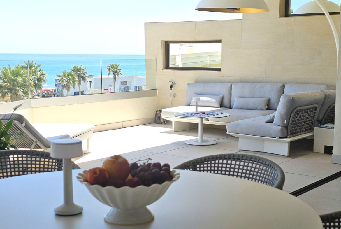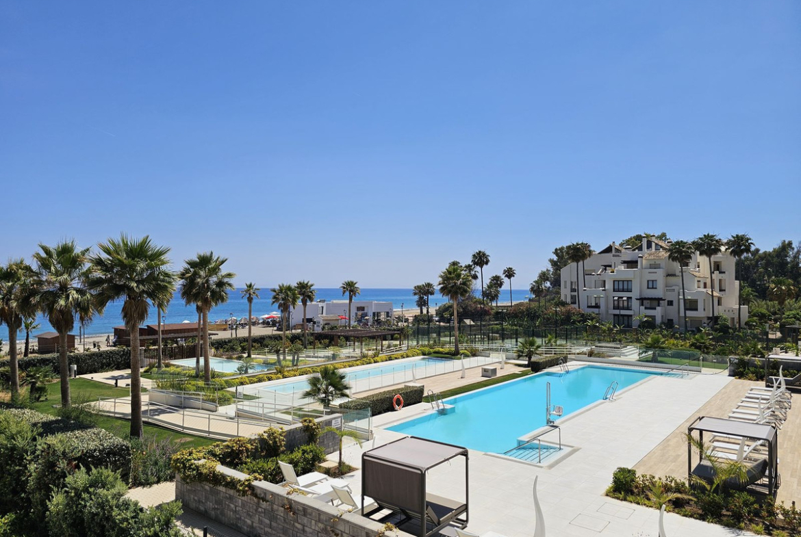 This is a perfect apartment by the sea, consisting of 2 bedrooms and 2 bathrooms, an open kitchen with an island, and a salon from where you can enjoy a magnificent view of the Mediterranean Sea. The sitting area and the master bedroom are connected to the 40m2 covered terrace. The apartment is located on the 1 floor, south facing. There is an underground garage and store room.