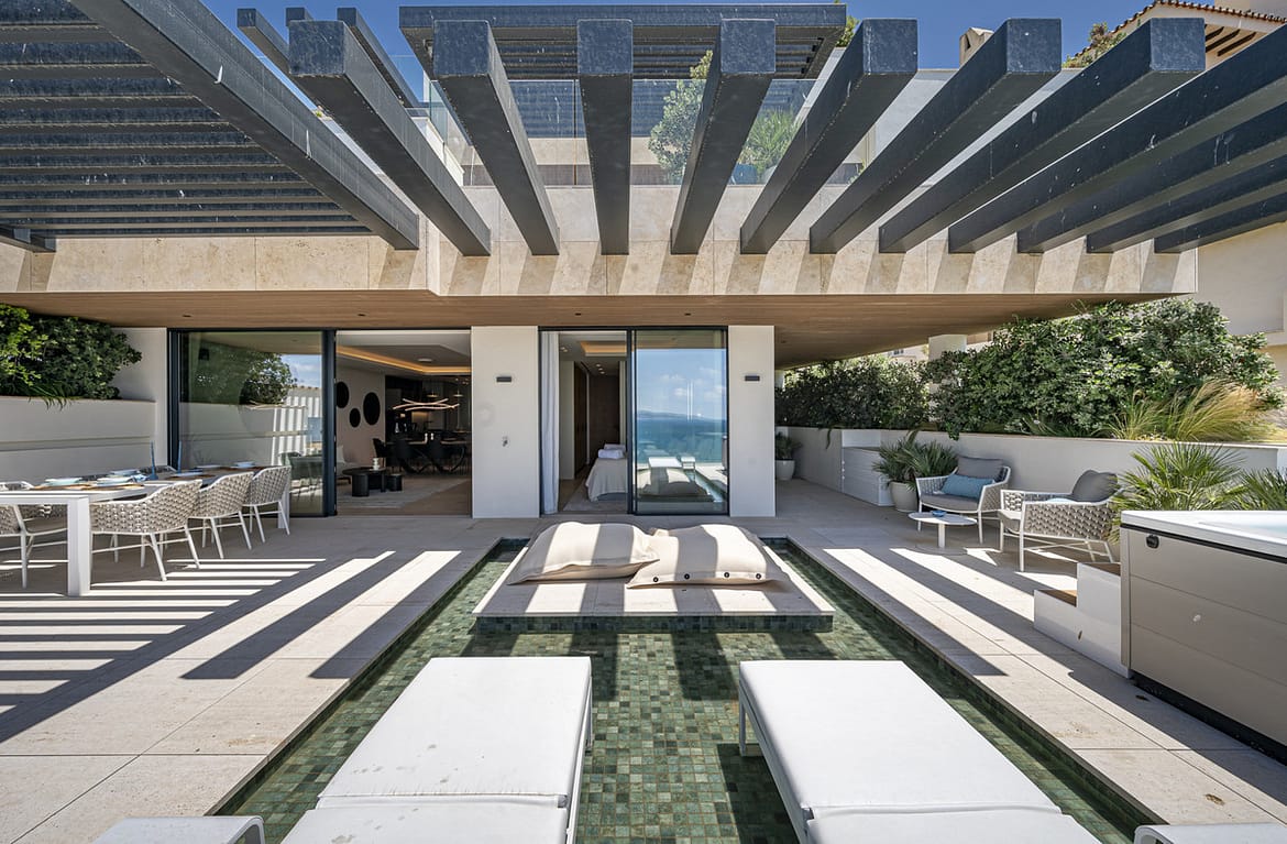 Spanning an impressive 120m² of interior space, the apartment features two generously proportioned bedrooms and two meticulously designed bathrooms. The fully fitted kitchen, equipped with high-end appliances, flows seamlessly into the open-plan dining and living areas, creating a perfect space for entertaining or relaxation. Premium finishes, including marble flooring, double glazing, and glass doors, enhance the sophisticated aesthetic, while the home automation system, central heating, and air conditioning ensure year-round comfort. Additional highlights include a utility room, storage room, and a private garage.