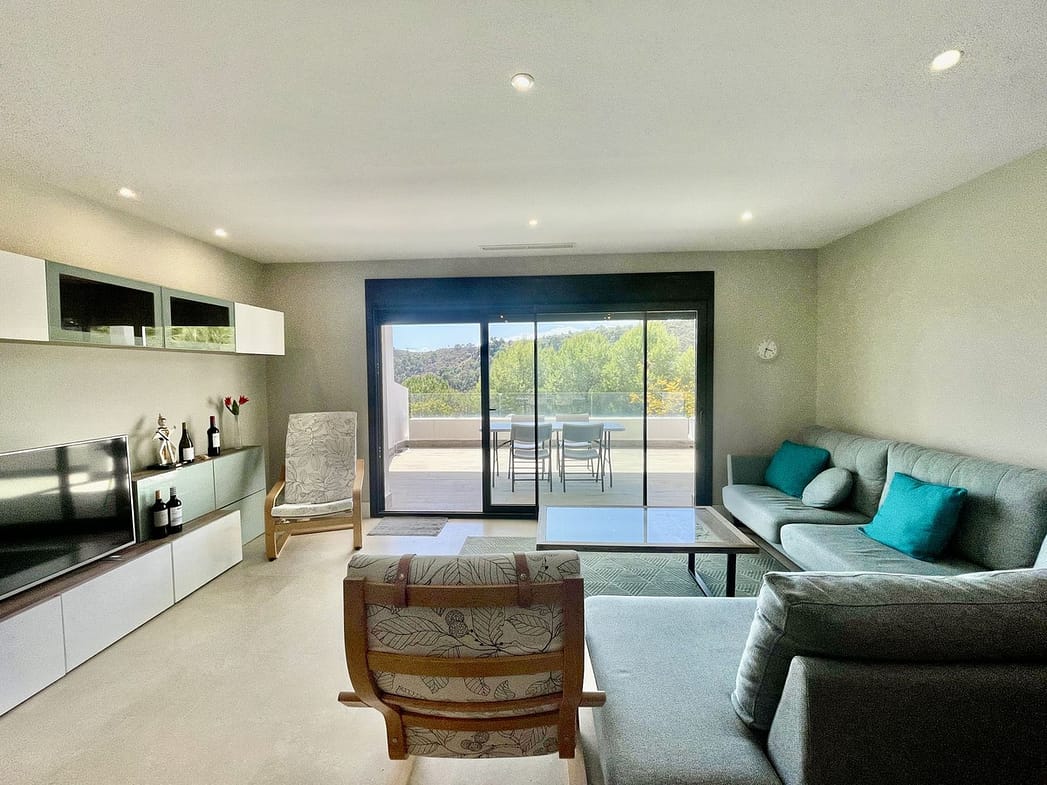 Inside, the apartment boasts a bright and airy layout with an open-plan living and dining area that flows seamlessly onto the terrace. Both bedrooms are spacious and enjoy direct access to the outdoor area, enhancing the indoor-outdoor lifestyle this home offers. The property is finished to a modern standard throughout, with two full bathrooms and a fully fitted kitchen with Bosch appliances and separate utility room.