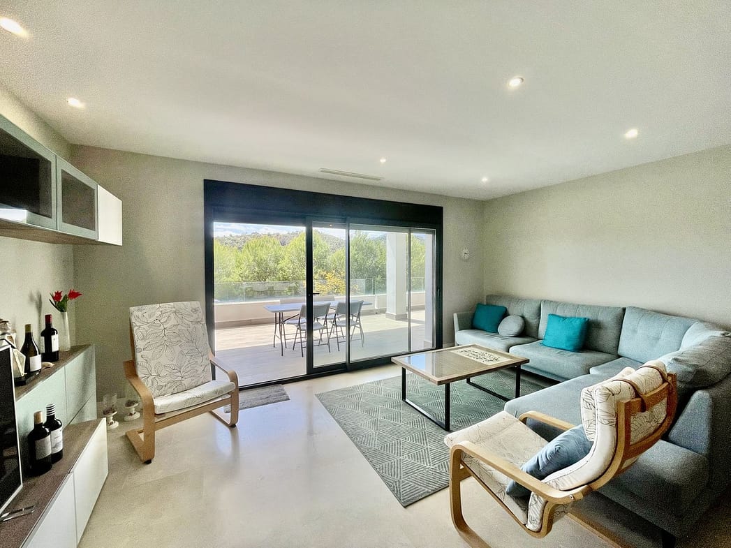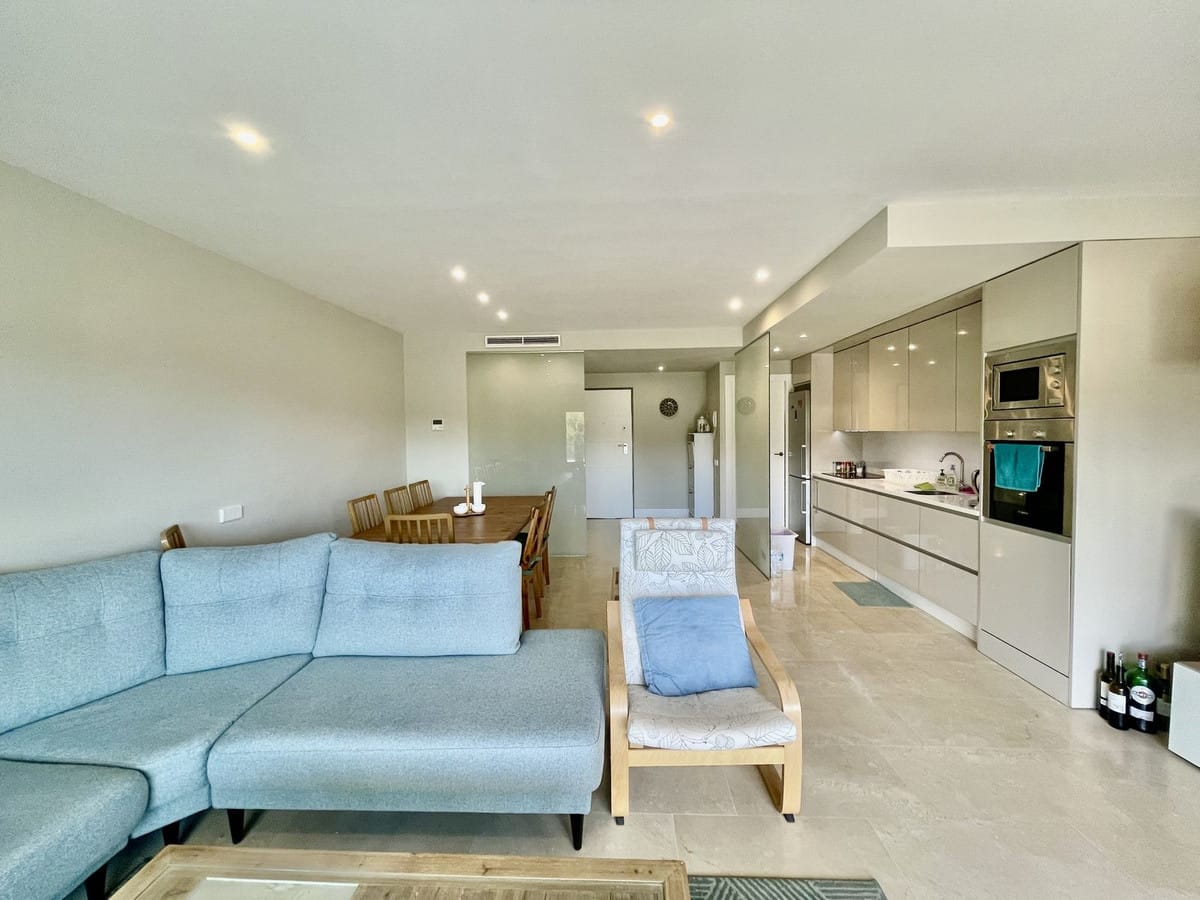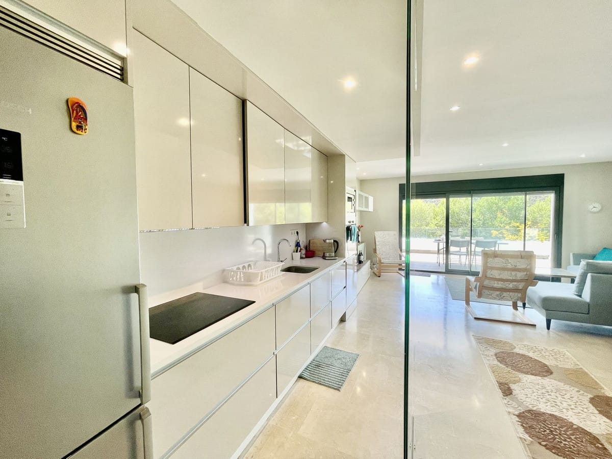 This stylish two-bedroom, two-bathroom apartment is located on the first floor of the sought-after Ocean Hills complex in Selwo, Estepona. Completed in 2017, the property offers a generous 94 m² built area, with 80 m² of usable interior space, complemented by an impressive 51 m² terrace.