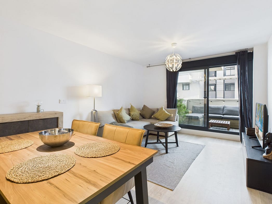 The living room opens onto a private terrace, an inviting space to enjoy a morning coffee or unwind at sunset.
