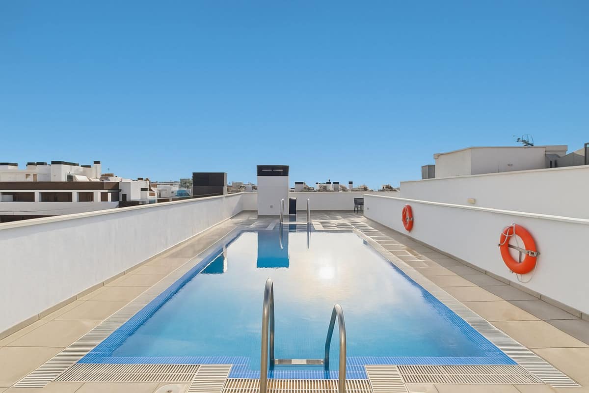 Modern residential complex with rooftop swimming pool