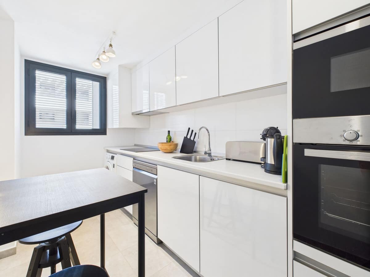 Inside, the apartment boasts a generously sized living area, complemented by a separate, fully equipped modern kitchen.