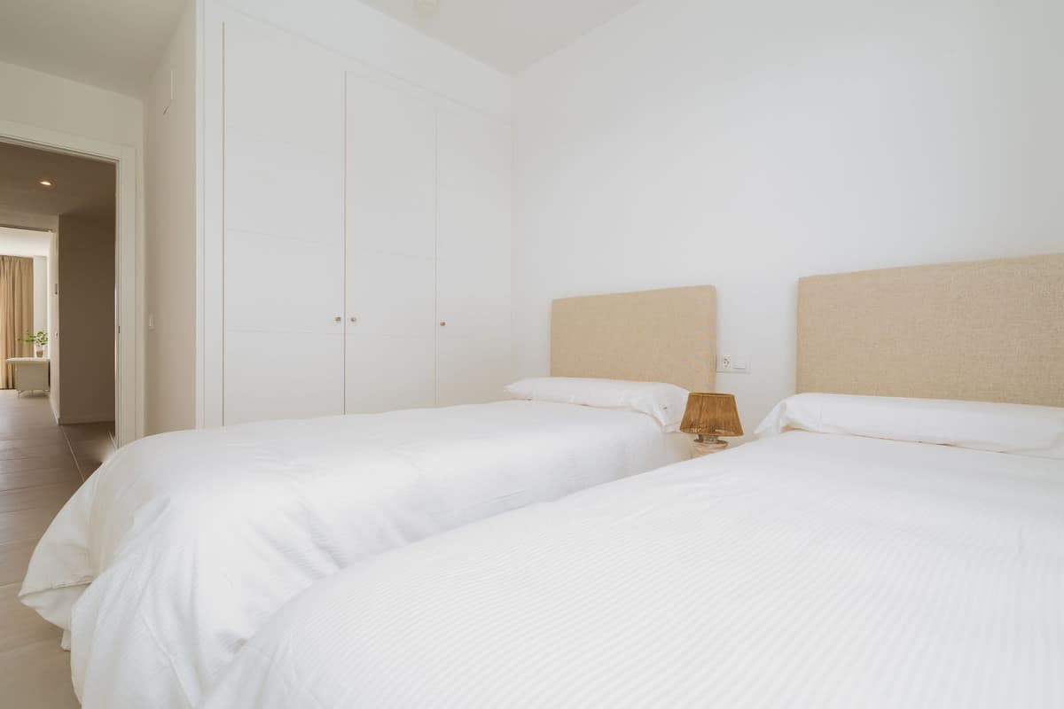 Situated on the 1st floor, this bright and airy apartment boasts a spacious living room with an open, fully equipped kitchen, leading to an East-facing terrace with partial sea views. The two generous double bedrooms are West-facing, offering lovely views of the garden and pool.