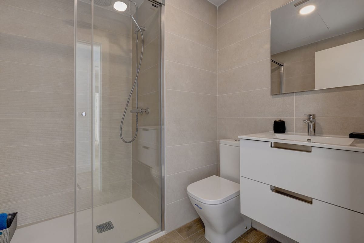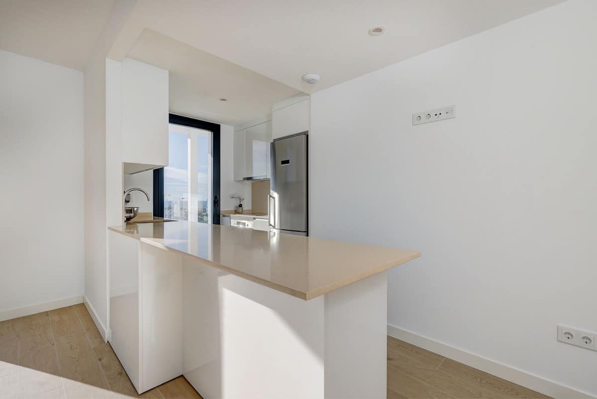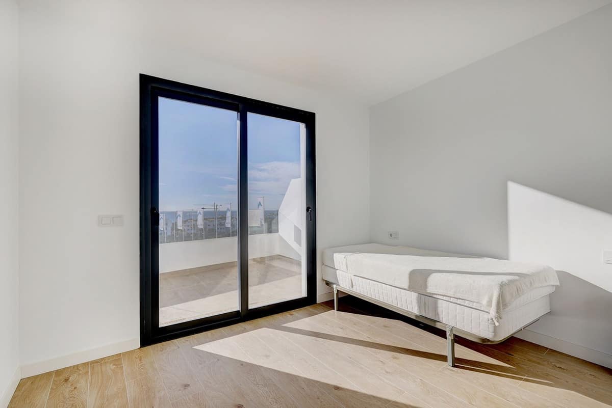 To the right of the entrance, a hallway leads to the private night area, where the main bedroom is with its en-suite bathroom, and a well-appointed bedroom, with an external bathroom, also used as a guest bathroom. Both bedrooms enjoy direct terrace access, abundant natural light, and stunning sea views.