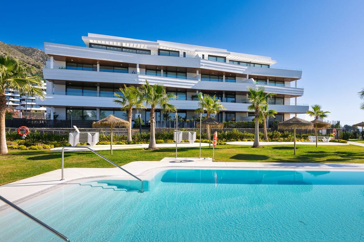The apartment features a generous interior space complemented by a 34m² private terrace. The terrace offers panoramic, mountain, garden, pool, urban, and partial sea views, making it a perfect spot for outdoor dining or simply enjoying the Mediterranean climate. The communal saltwater swimming pool and landscaped gardens further enhance the appeal, whilst two private garage spaces and a storage room add to the convenience.