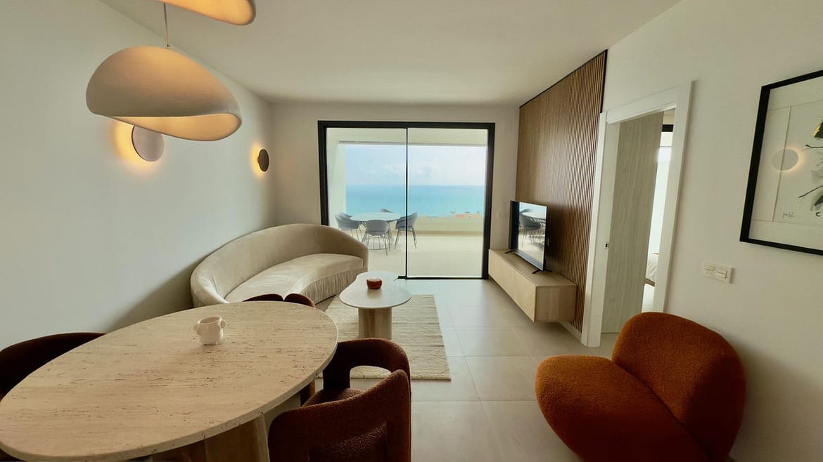 Beautifully presented 2-bedroom, 2-bathroom apartment located in the prestigious Reserva del Higuerón, El Higuerón. The property offers an open-plan living area with direct access to a spacious terrace and stunning sea views, a fully equipped modern kitchen, and a master bedroom with en-suite bathroom. Just 300 meters from the sandy beaches of Carvajal.