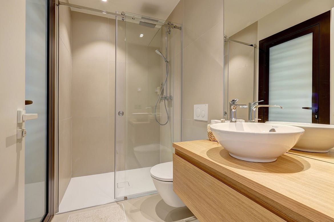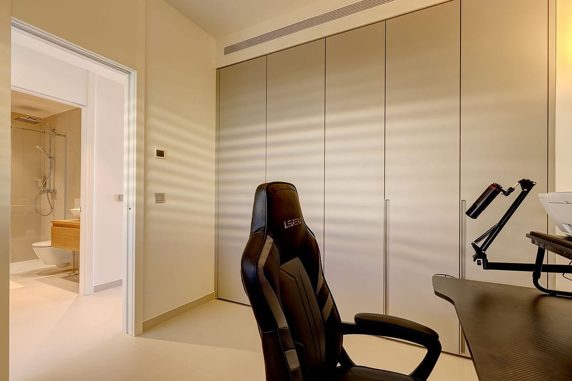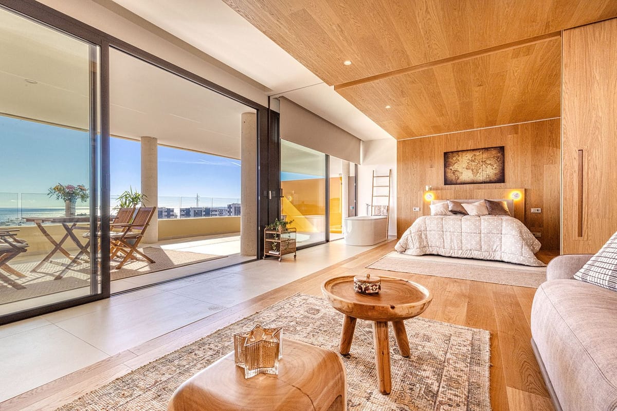 Benefiting from a direct south orientation, the home enjoys beautiful natural light throughout the day and lovely sea views from the living area and terrace. The interior combines modern design with warm, high-quality finishes. The layout is smart and open, with floor-to-ceiling windows that enhance brightness and space. The master bedroom features a sliding wall that opens onto the living room, adding a luxurious and flexible design element.