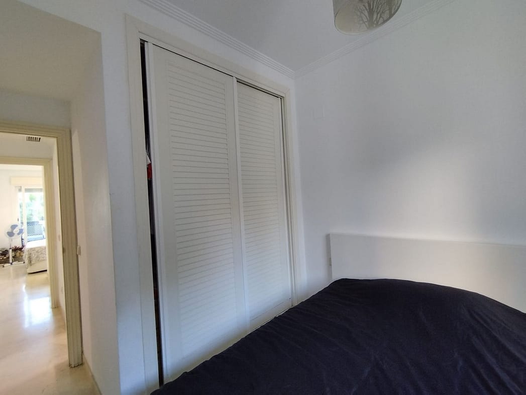 The property has two bedrooms with built-in wardrobes, two full bathrooms (one en suite), a spacious living room with access to a terrace, and a fully equipped separate kitchen. Air conditioning (hot/cold), an elevator, 24-hour security, paddle tennis courts, two swimming pools (one open year-round), a children's area, and large green areas for walking.