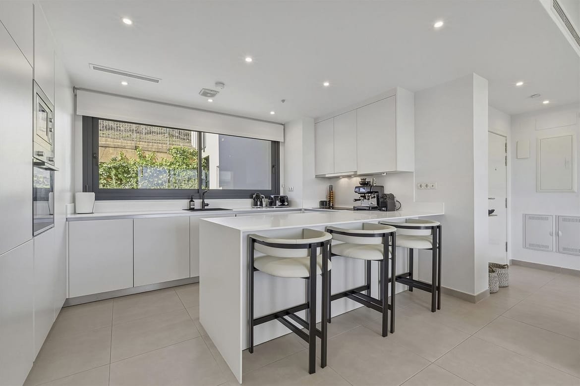 Bedrooms with Direct Terrace Access – The master suite enjoys direct access to the main terrace, allowing the panoramic golf views to be appreciated from both inside and out. The en-suite bathroom is spacious and contemporary, featuring a walk-in shower and double vanity. The second bedroom also benefits from direct terrace access and the same beautiful outlook, making it ideal for guests or family. A second modern bathroom with walk-in shower completes the accommodation.