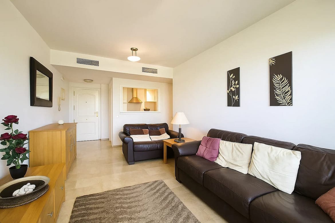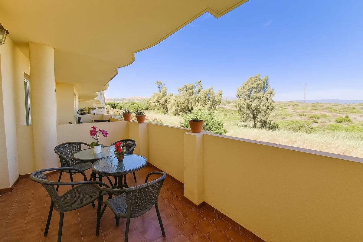 The apartment offers a spacious private terrace with views towards the countryside and surrounding hills, perfect for outdoor dining or relaxing in the sun. Set within a gated complex, the property benefits from beautifully landscaped gardens and access to communal swimming pools, creating a peaceful environment just a short walk from the beach.
