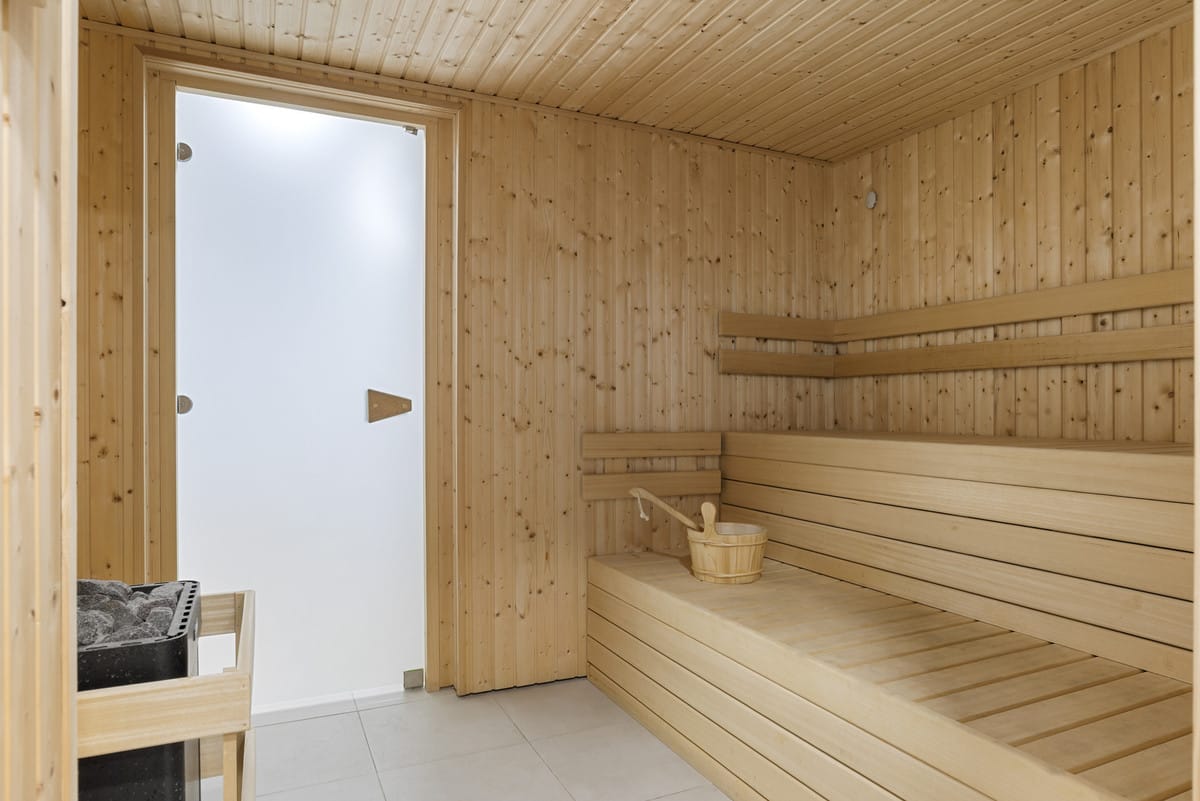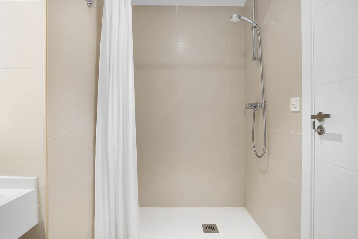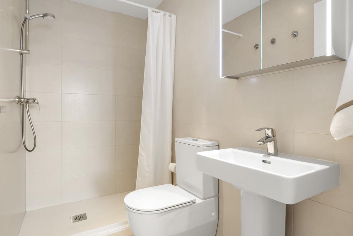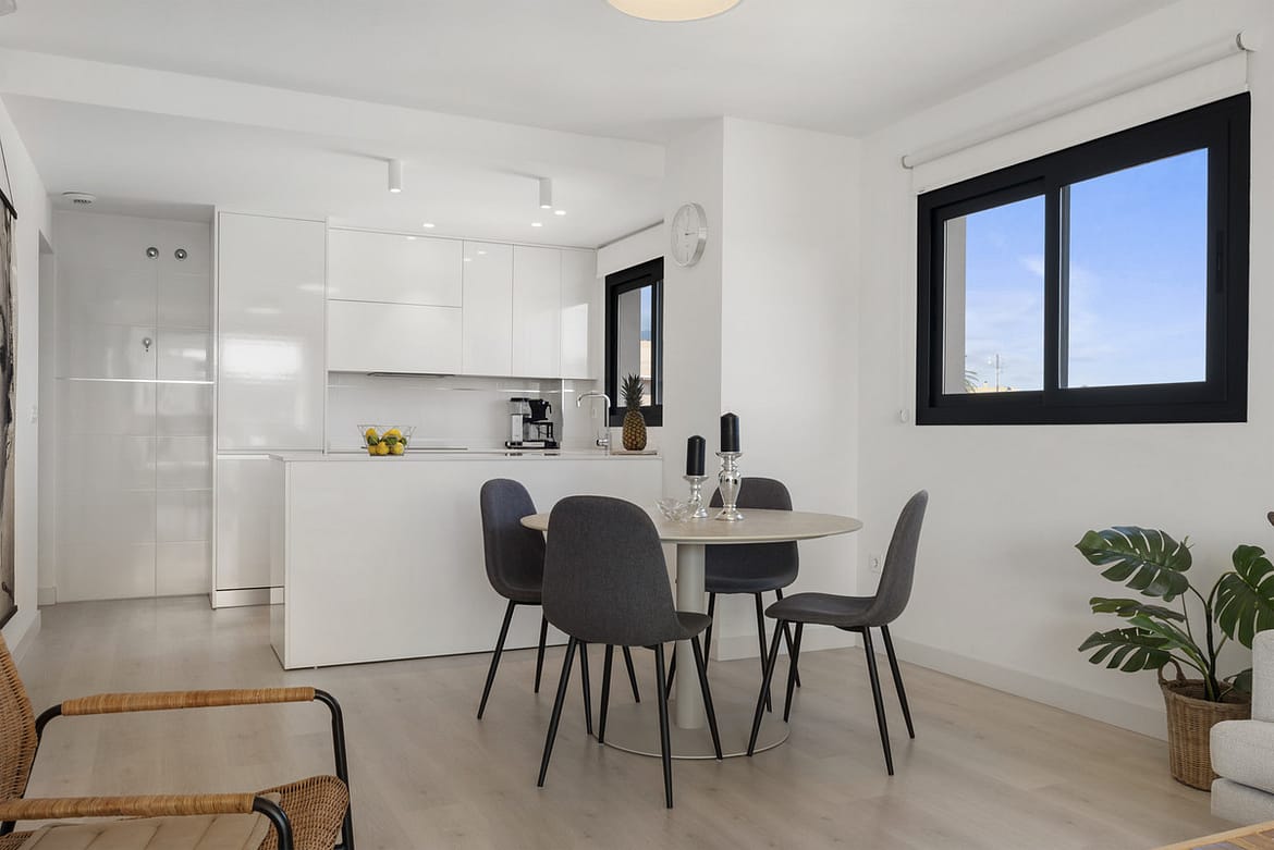 The heart of the apartment is the open-plan kitchen, flowing seamlessly into the bright living and dining area. Large sliding glass doors open onto the spacious south facing terrace, perfect for al fresco dining, relaxing, or enjoying the Mediterranean sunshine. The interiors are light-filled, airy, and designed for modern coastal living, combining neutral tones with high-quality finishes.