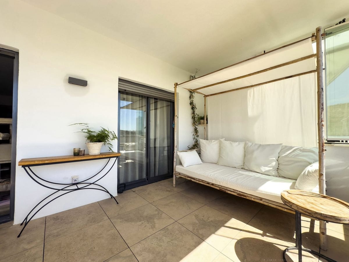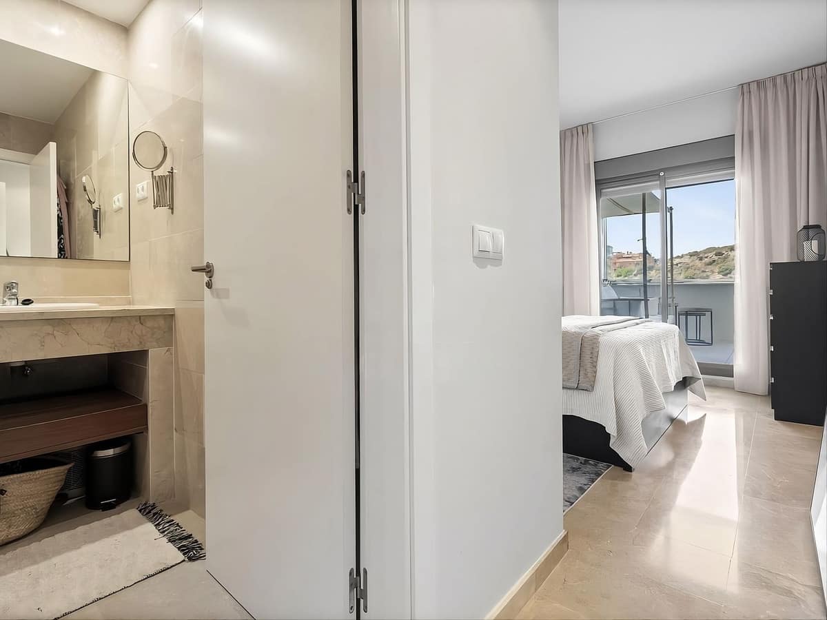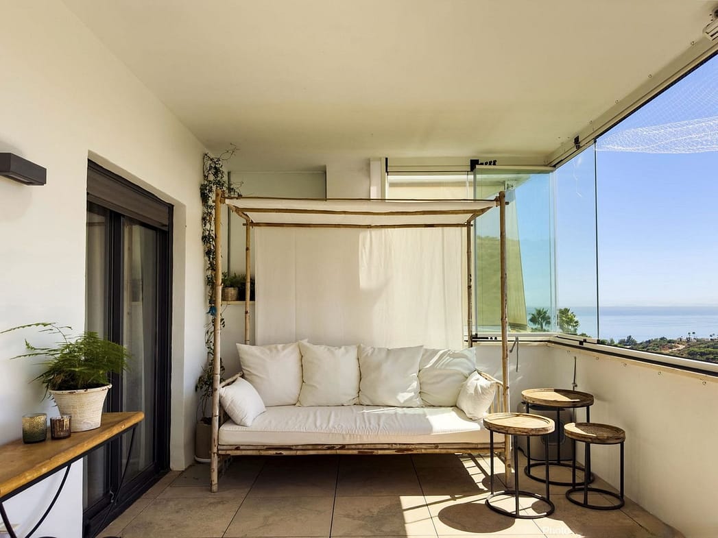 The spacious living room opens onto a southwest-facing terrace, transformed into a true additional living space thanks to the “cortinas de cristal” — frameless glass curtains. These adjustable panels allow you to enjoy the terrace year-round: fully open in summer, partially or fully closed depending on the season.