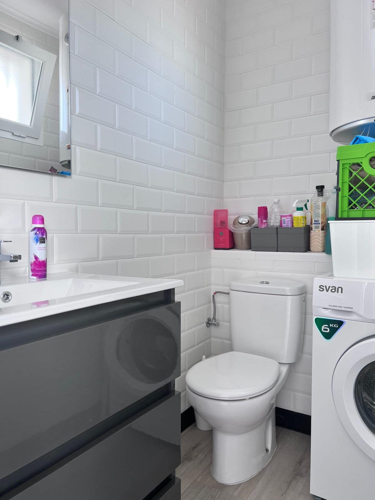Upon entering, you will find a separate guest toilet equipped with a washing machine. The fully fitted open-plan kitchen includes a dishwasher, oven, hob, extractor fan, and fridge-freezer, and flows seamlessly into the living area. From here, you access the inviting main terrace — the perfect spot to unwind and enjoy the Mediterranean climate.