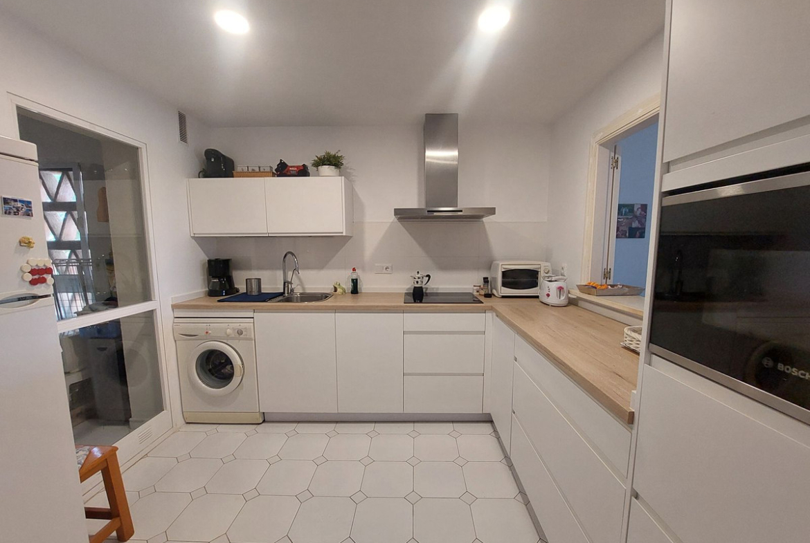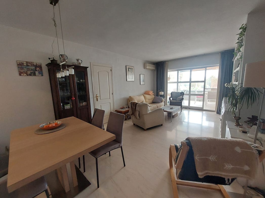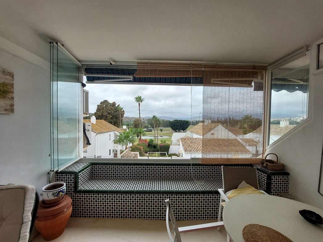 The living/dining room is notable for its brightness thanks to the large windows that open onto a spacious terrace enclosed by glass curtains, from which you can enjoy views of the golf course and the residential area.