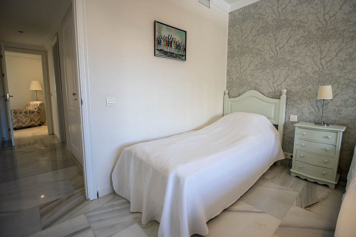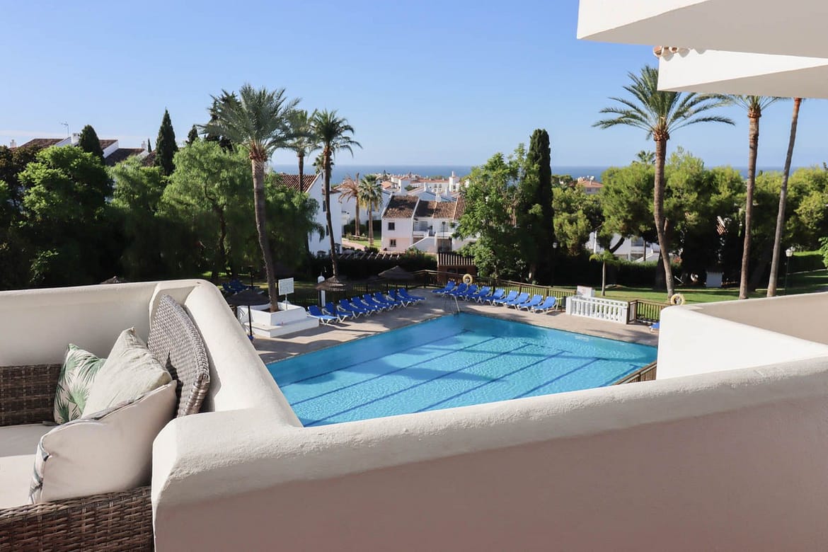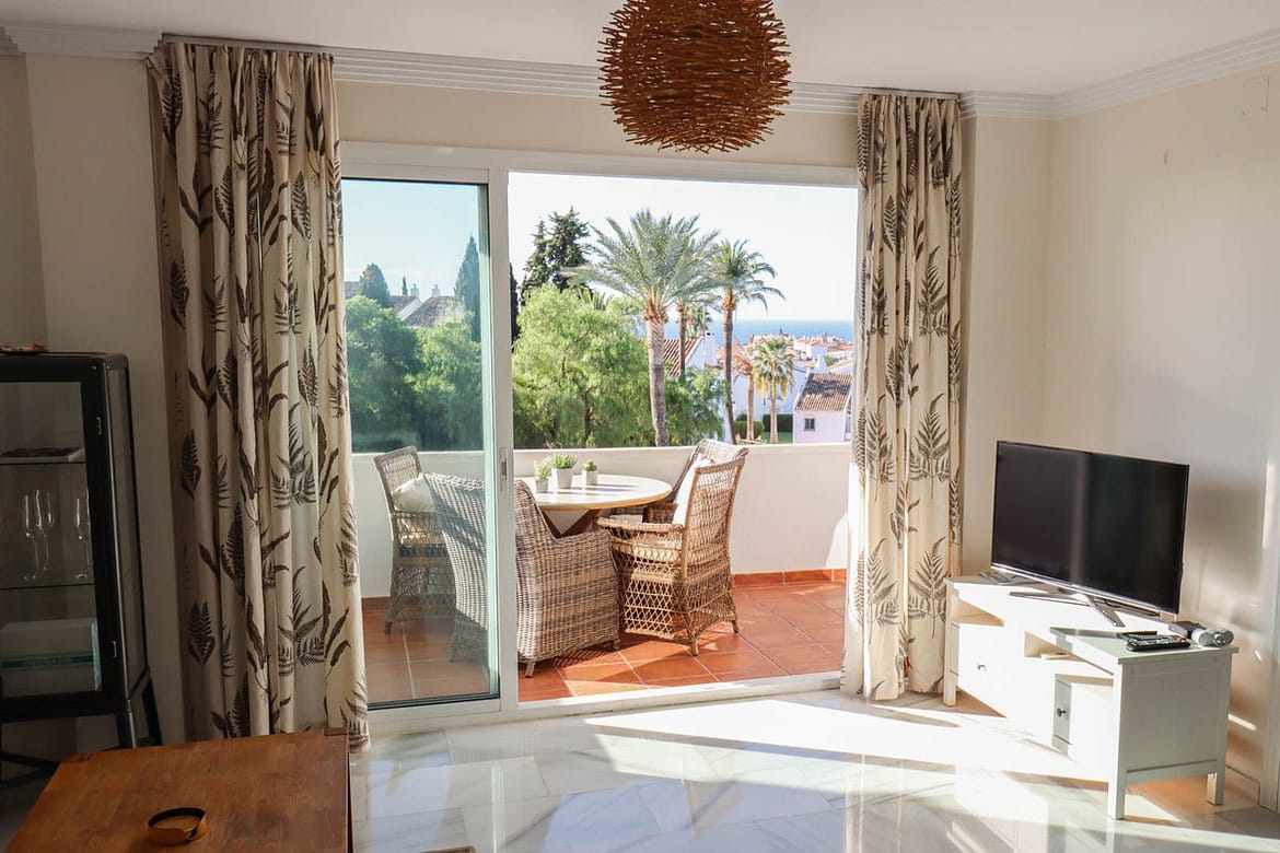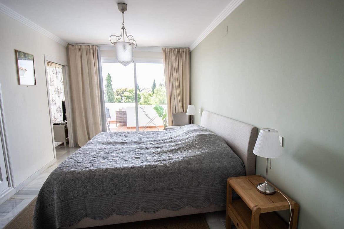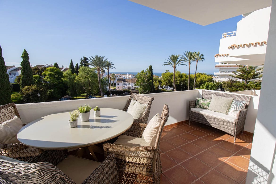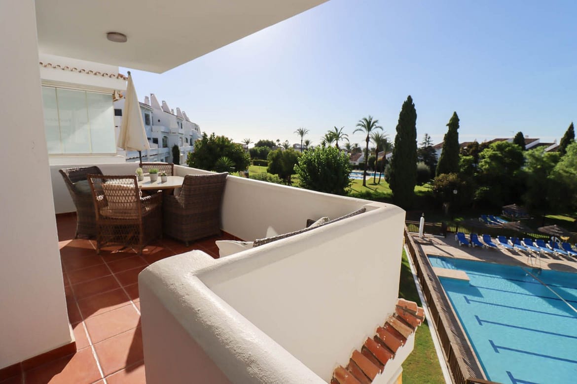 Welcome to this spacious 2 bedroom and 2 bathroom apartment in the well-kept and perfectly situated urbanization of Royal Gardens. The apartment has an open plan kitchen connecting nicely with the living area. The terrace has a dining area with beautiful views of the garden and the mediterranean see. The terrace also has a smaller part for barbeque or relaxing outside the master bedroom. This is the perfect place if you appreciate leaving the car in the garage while walking to the beach, shops or restaurants. In the near surrounding you find some of the best golf courses in the area. The apartment comes with a garage and a storage room which you can reach easily with the elevator. The urbanization is a secure and gated community with 24 h surveillance cameras.