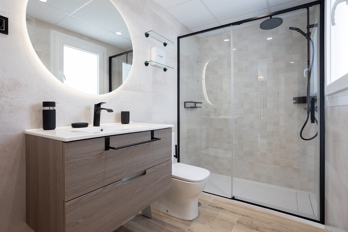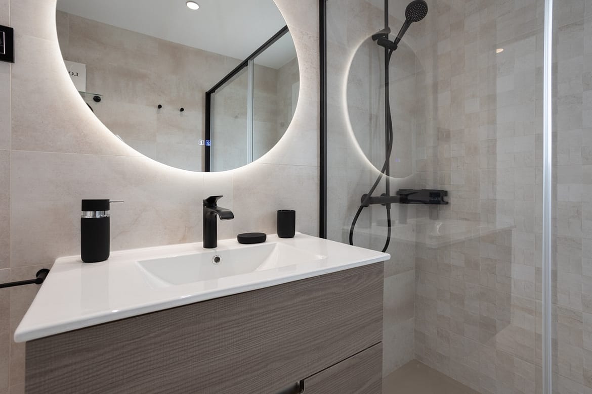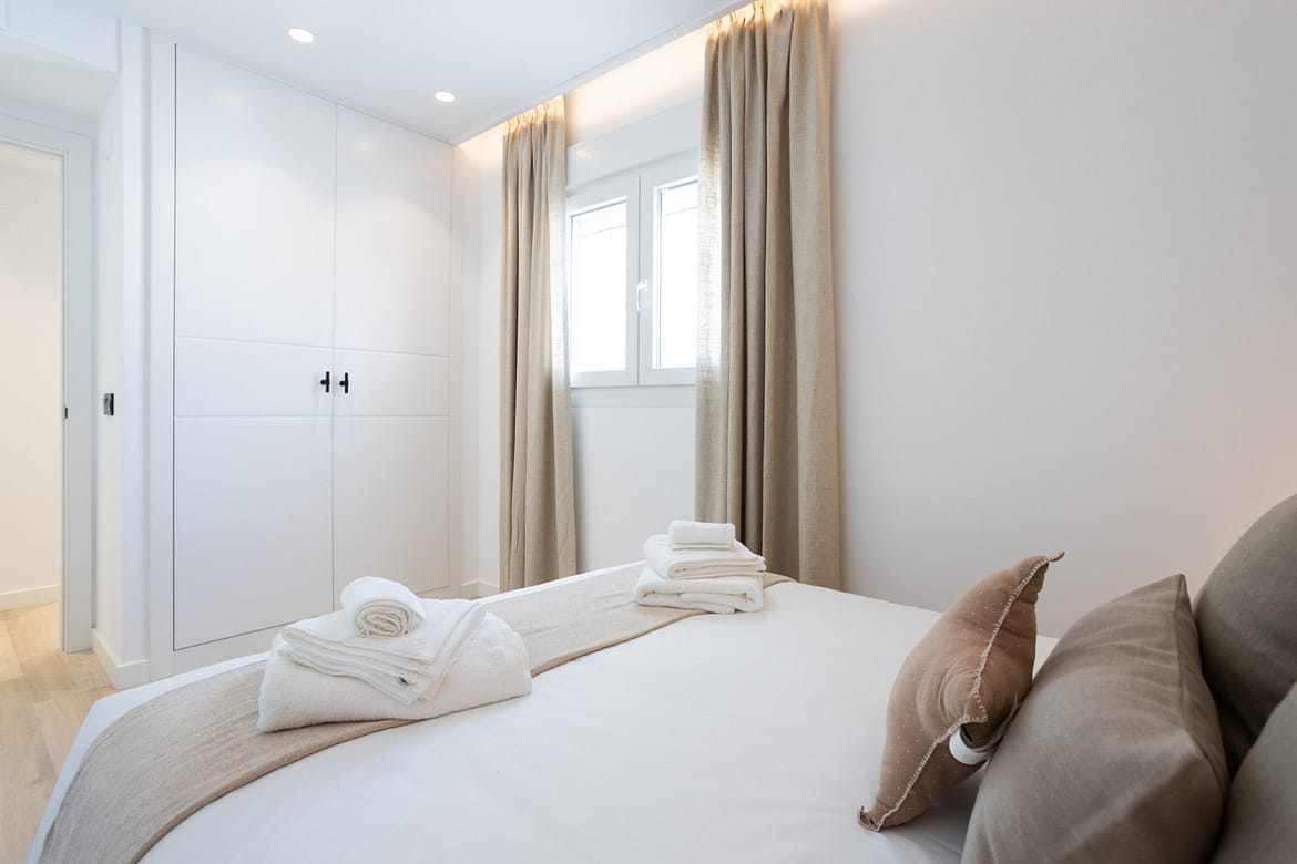 Both bedrooms open to a wide terrace that is also accessible from the living room. The master bedroom has an ensuite bathroom with a walk-in shower, while the second bedroom sits beside a modern guest bathroom. Clean design and neutral tones create a calm and welcoming atmosphere.