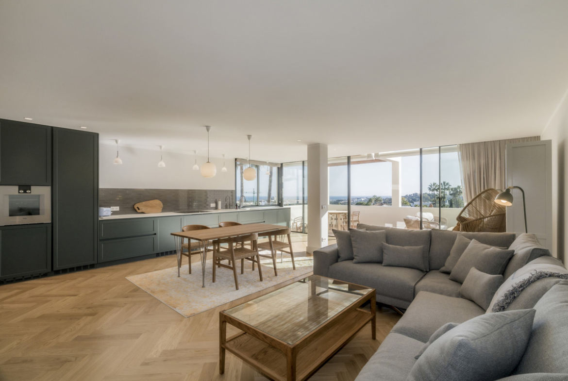 Step into luxury with this newly renovated 2-bedroom, 2-bathroom middle-floor apartment in the heart of Nueva Andalucía. Designed for modern living, it features a state-of-the-art Gaggenau kitchen, elegant herringbone wood flooring, and a spacious southwest-facing terrace offering breathtaking panoramic views.