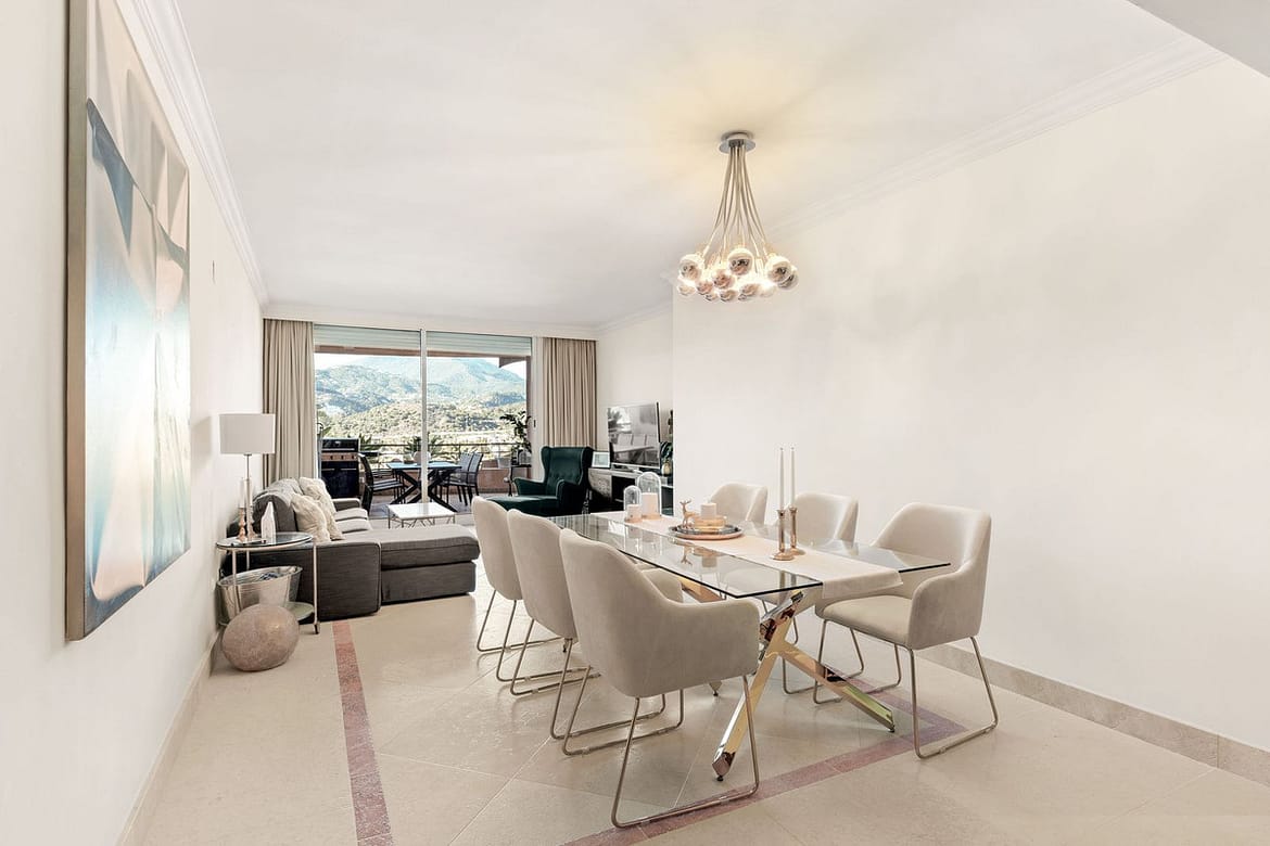 Set within the emblematic community of Magna Marbella, this stunning first floor apartment offers panoramic views to Naranjos Golf and the mountains beyond.