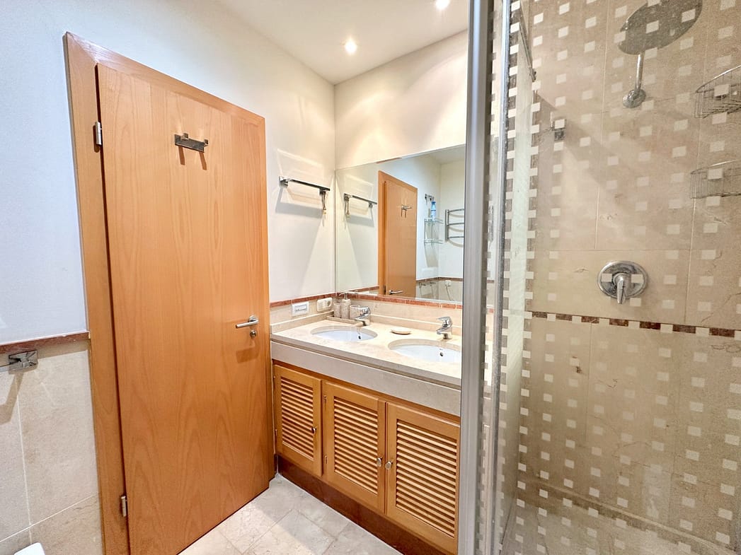 The property features two spacious bedrooms and two well-appointed bathrooms, making it perfect for small families or couples. The interior is designed with an open-plan kitchen that is fully fitted and equipped, seamlessly integrating with the living space to create a modern and functional environment. The apartment is offered fully furnished, with fitted wardrobes providing ample storage solutions. High-quality finishes, such as marble floors, enhance the overall elegance of the home, while air conditioning ensures year-round comfort.