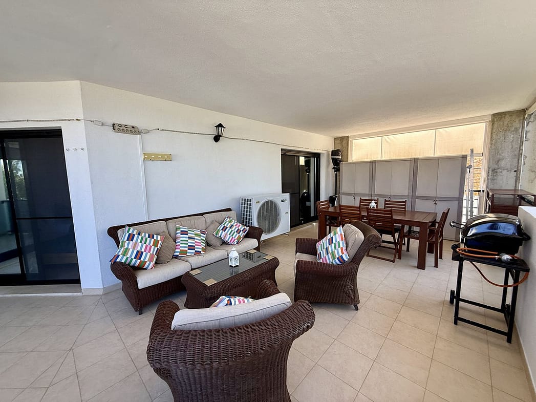 Designed with comfort in mind, the property includes solar protective glass, mosquito screens on all windows, air conditioning (hot and cold), marble flooring, and double glazing. It is tastefully furnished and move-in ready. The fully fitted kitchen is complemented by a utility room, while fitted wardrobes offer excellent space throughout.