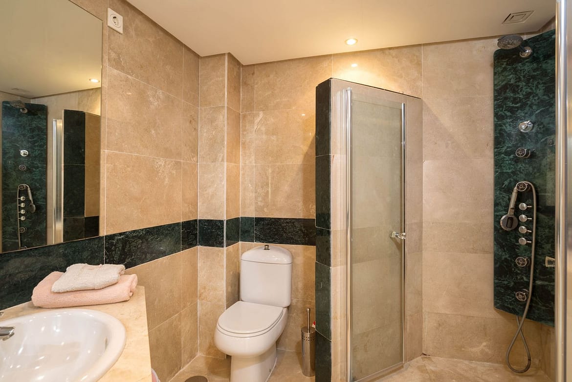 The spacious master bedroom features an en-suite bathroom with a bathtub, ample wardrobes, and room for a double bed and a desk. The second bedroom offers excellent space for two single beds and a large, elegant en-suite bathroom. There is also a separate guest toilet.