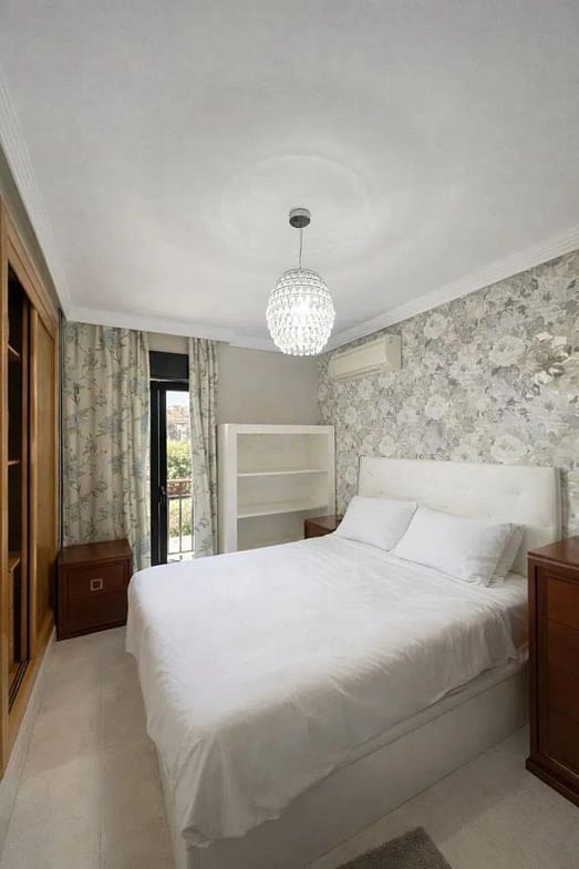 The interior layout offers two bedrooms and two bathrooms, including a master bedroom, a spacious living-dining room with a very cozy atmosphere, and a generously sized separate kitchen. The property has been modernized with a contemporary kitchen, renovated bathrooms, good quality flooring, and a neutral and elegant aesthetic. It has air conditioning, well-designed lighting, and practical storage solutions.