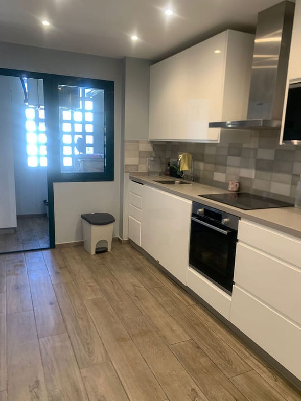 A beautifully renovated modern and bright kitchen comes fully equipped with all modern appliances with soft closing wall and base storage cupboards and drawer units which are of an Italian design and finished to a high-end quality, complete with contrasting worktop surfaces. Adjacent to the kitchen, a glass door leads onto a very useful utility room which houses the mains gas boiler, air con machine, washing machine, and more storage cupboards with worktop surfaces.