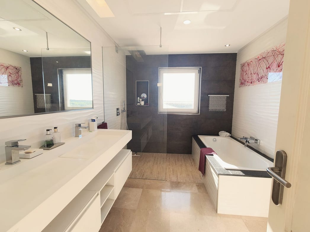 The master bedroom, with en-suite bathroom, has direct access to the terrace and enjoys abundant natural light throughout the day. Additional features include marble floors, hot & cold air conditioning, electric blinds, underground parking for one car and one golf buggy, and a storeroom.