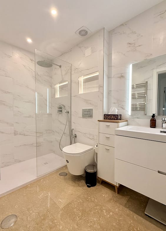 Designed for effortless Mediterranean living, the bright open living space flows onto a generous 30 m² terrace — ideal for sun-soaked mornings and sunset evenings. The brand-new kitchen is fully fitted and features its own private terrace with charming sea views. The main terrace offers the comfort and privacy of a ground-floor setting, while the kitchen is elevated and opens onto its own terrace at third-floor level, enjoying pleasant sea views.