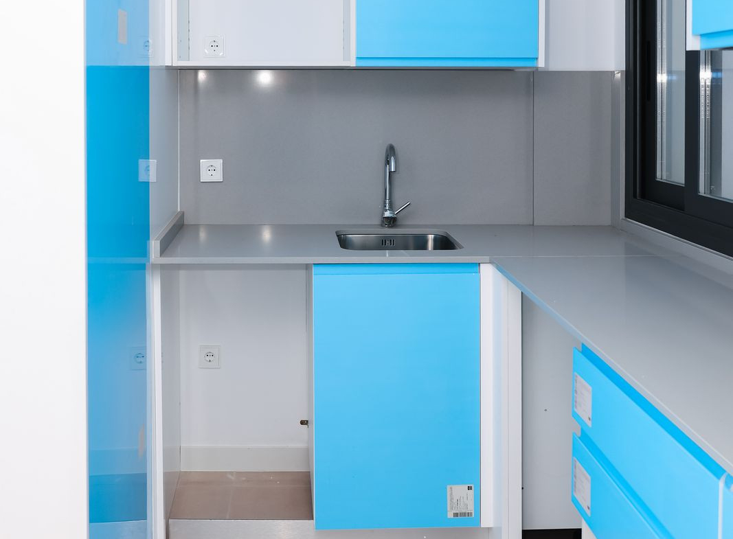 Fitted kitchen with ceramic hob, sink, and extractor hood