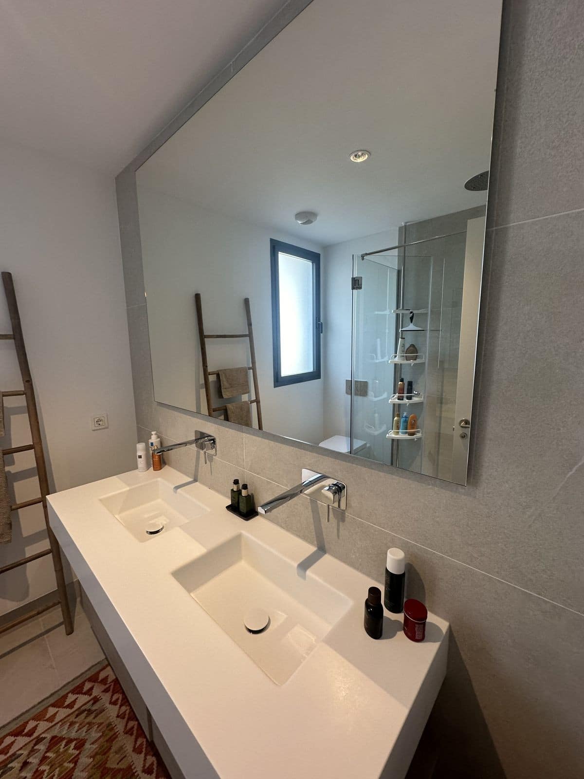 The apartment features two well-situated bedrooms. The master bedroom has direct access to the lovely terrace and boasts a luxurious en-suite bathroom. The second bedroom is located next to a separate bathroom. Both bathrooms have underfloor heating. Additionally, the bedrooms are fitted with shutters for extra comfort and privacy.