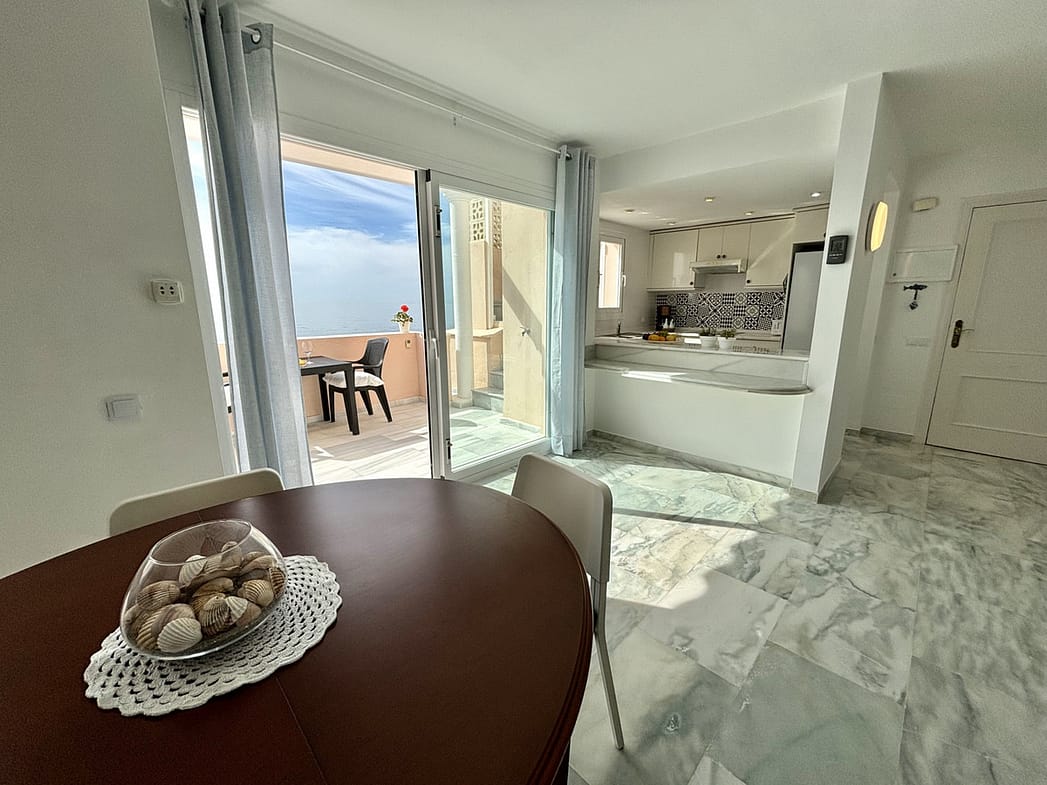 The interior of the penthouse spans 115m² and features an open and bright living room, a dining room, and a fully fitted kitchen with modern appliances. The marble floors and double glazing give the property an elegant touch. The penthouse also boasts a private terrace of 70m², which is ideal for outdoor dining, entertaining, and enjoying the stunning sea view.