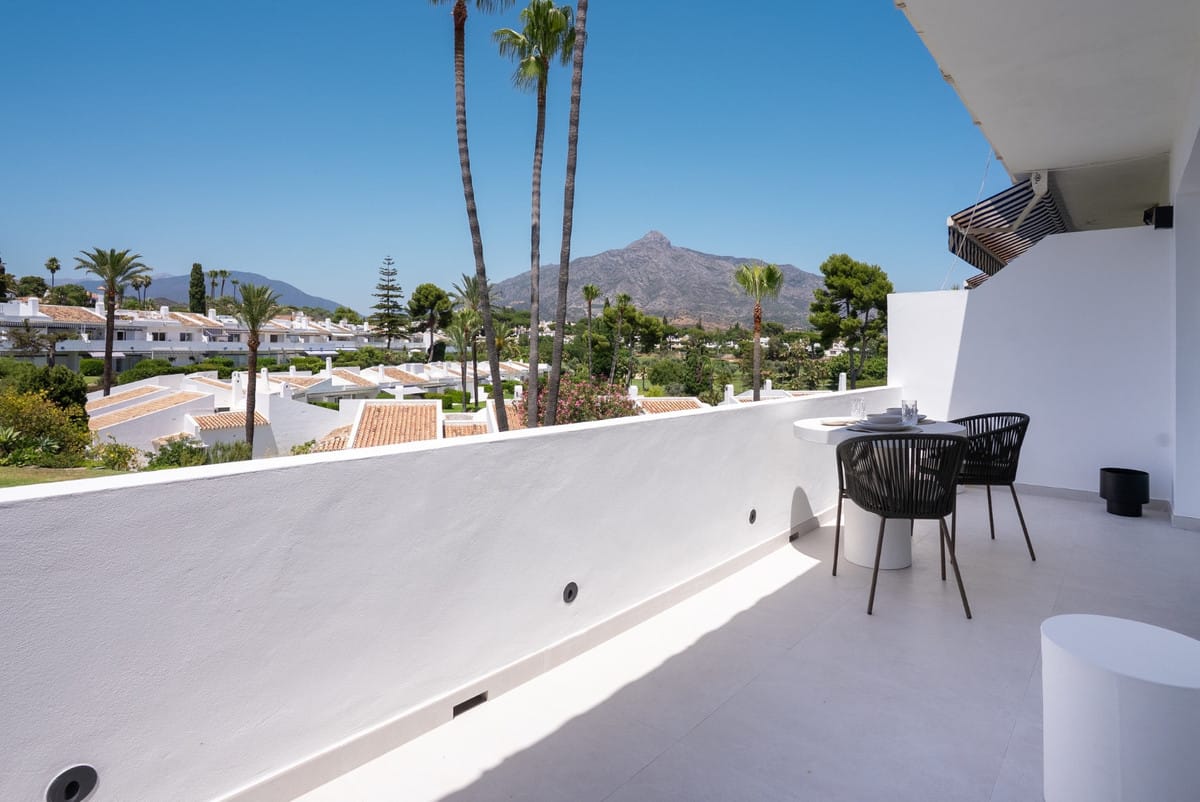 Penthouse Hideaway is a fully renovated duplex penthouse in Nueva Andalucía’s exclusive Golf Valley. Set in a secure gated community with a gym, spa, tennis and padel courts, pool, and lush gardens, this corner residence offers refined Mediterranean living with clean Scandinavian design. The home features two ensuite bedrooms, a sleek open-plan living area, and large terraces with stunning views across the coast and La Concha mountain.