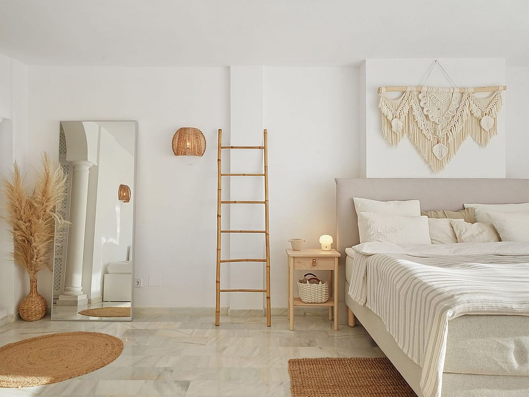 Master Bedroom: Spacious and filled with natural light, featuring an en-suite bathroom, walk-in closet, king-size bed, additional sofa bed, and private terrace with a hanging chair — ideal for relaxing.