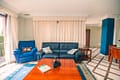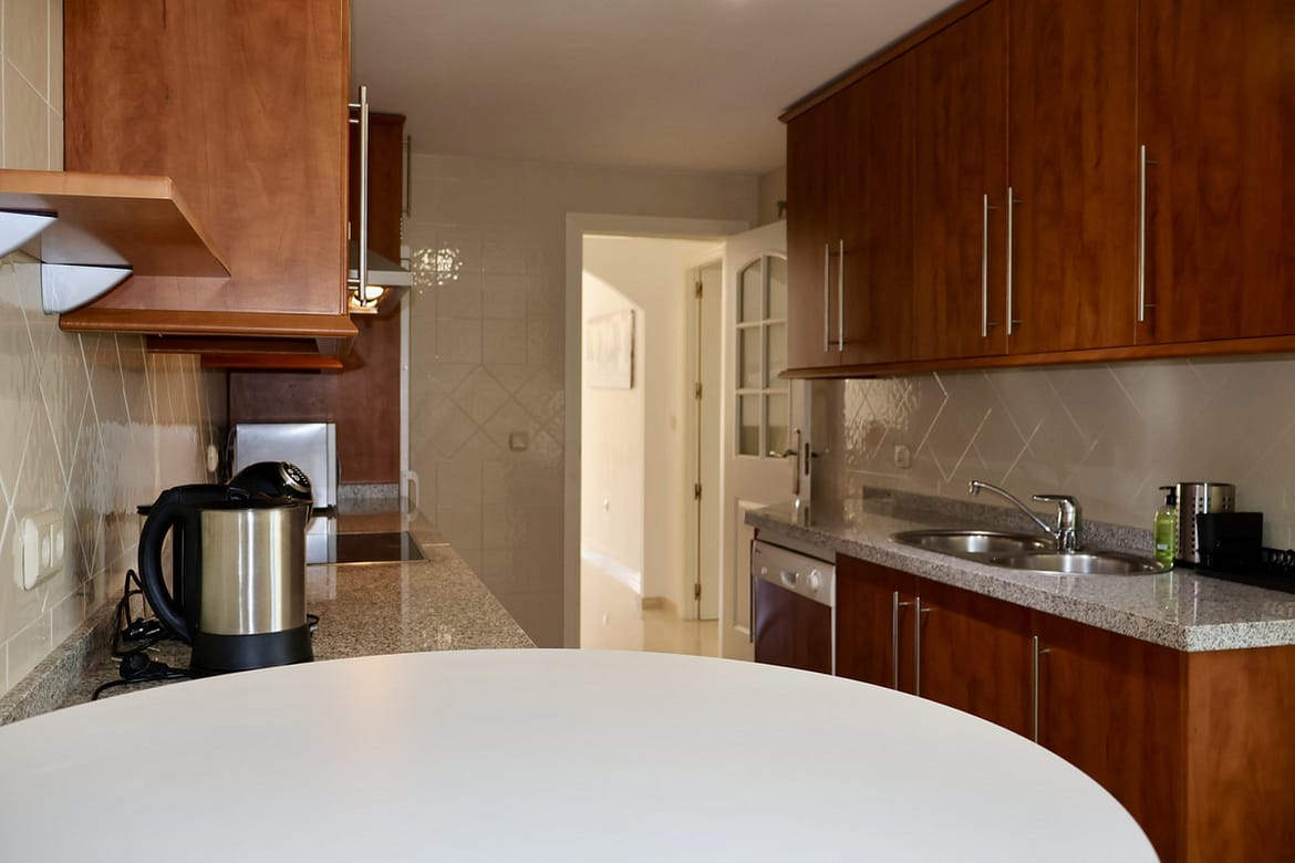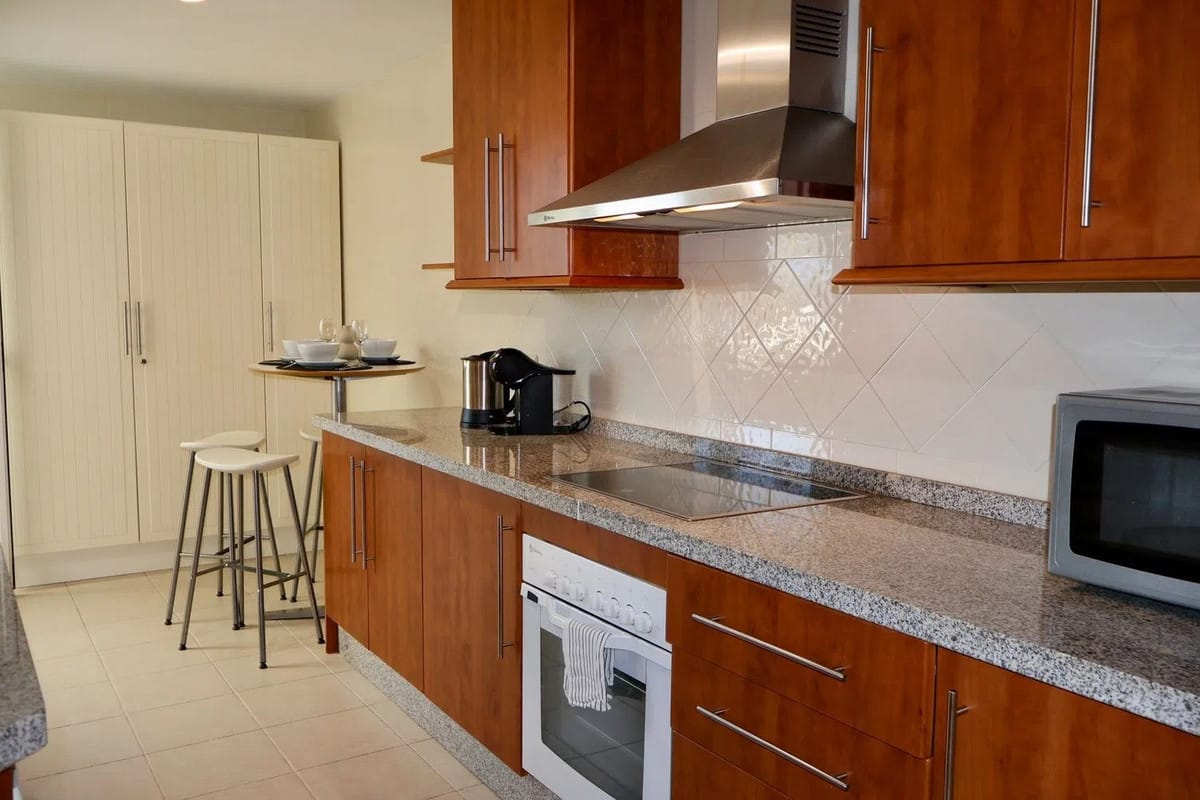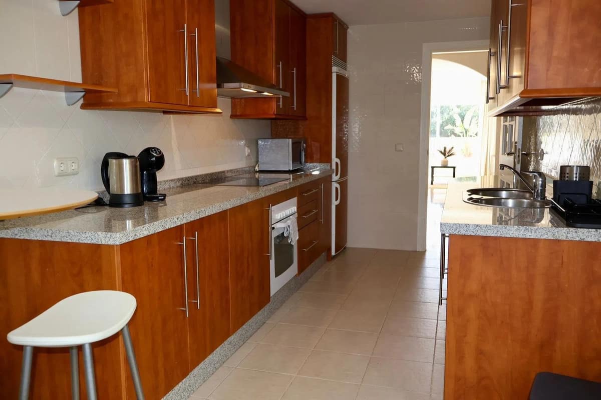 The interior layout is thoughtfully arranged, featuring two generously sized bedrooms, each with fitted wardrobes, and two modern bathrooms, including a stylish en-suite. The living and dining areas are fully furnished in a contemporary style, seamlessly connecting to the terrace and offering both sea and garden views. The fully fitted kitchen is equipped with high-quality appliances and a convenient breakfast bar, ideal for casual dining or entertaining guests. Adjacent to the kitchen, an enclosed balcony overlooks lush greenery, providing a tranquil spot for morning coffee or quiet reflection.