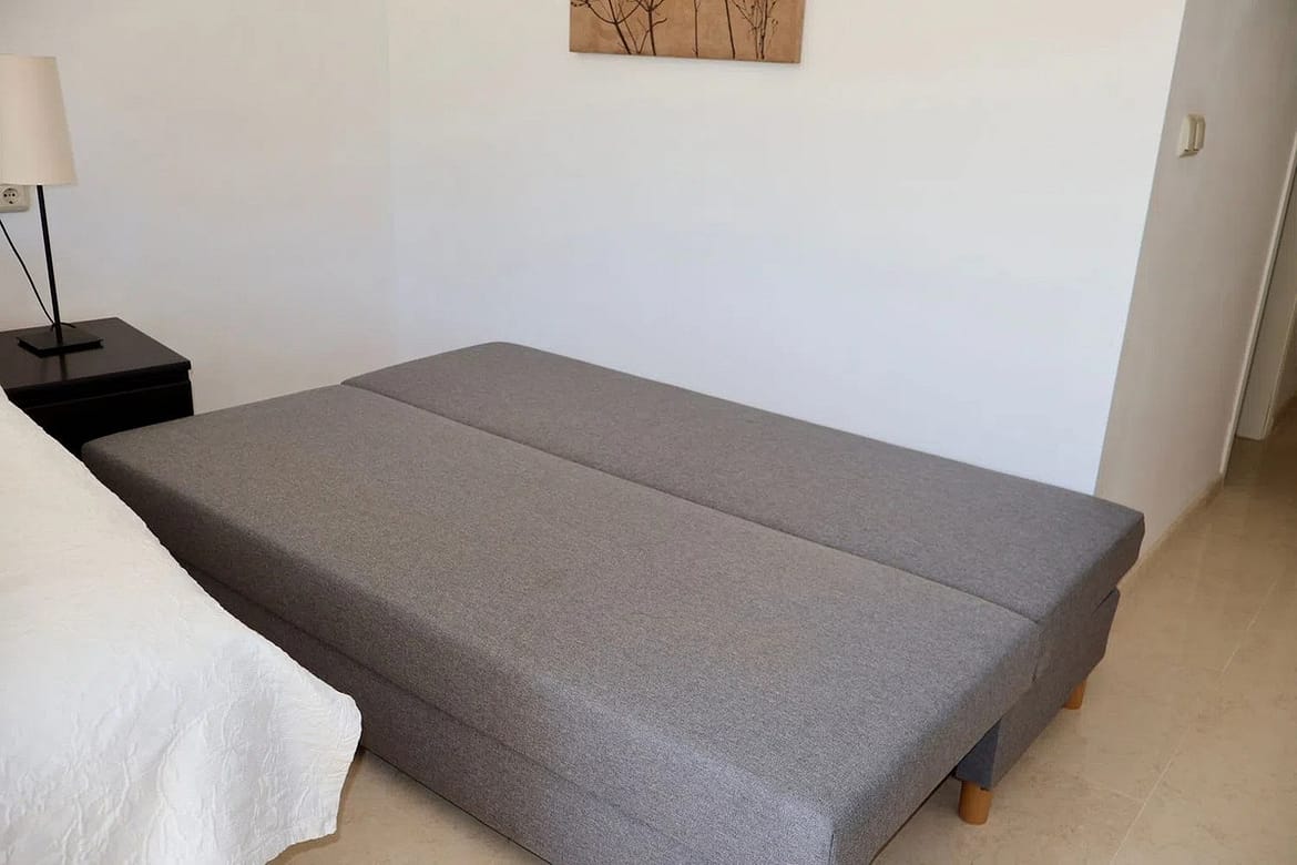 Tenants benefit from an array of premium amenities within this gated community, including six communal swimming pools—one of which is heated for year-round enjoyment—beautifully landscaped communal gardens, and a private garage. The property is in excellent condition and boasts features such as air conditioning, central heating, and a dedicated laundry room, ensuring comfort and practicality in every season.