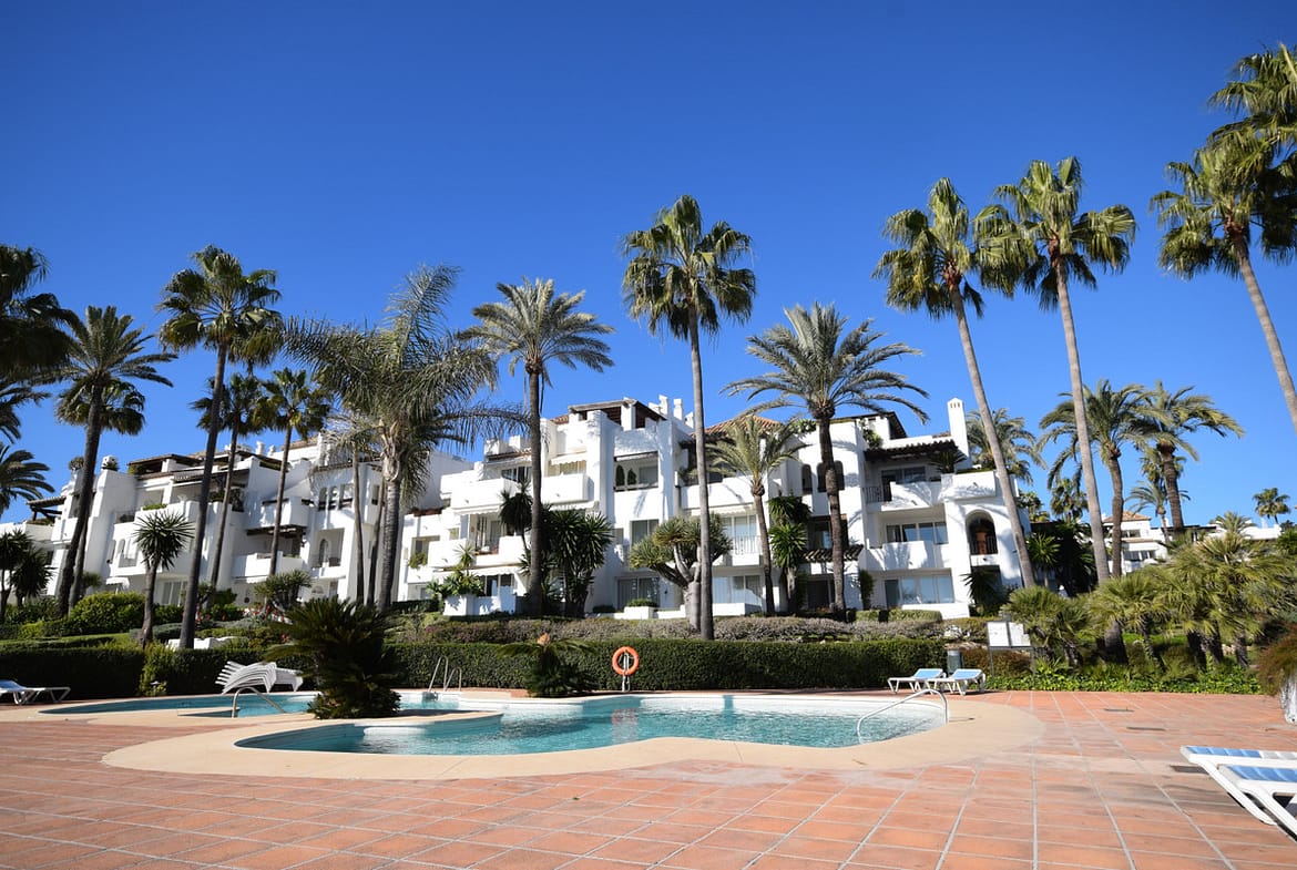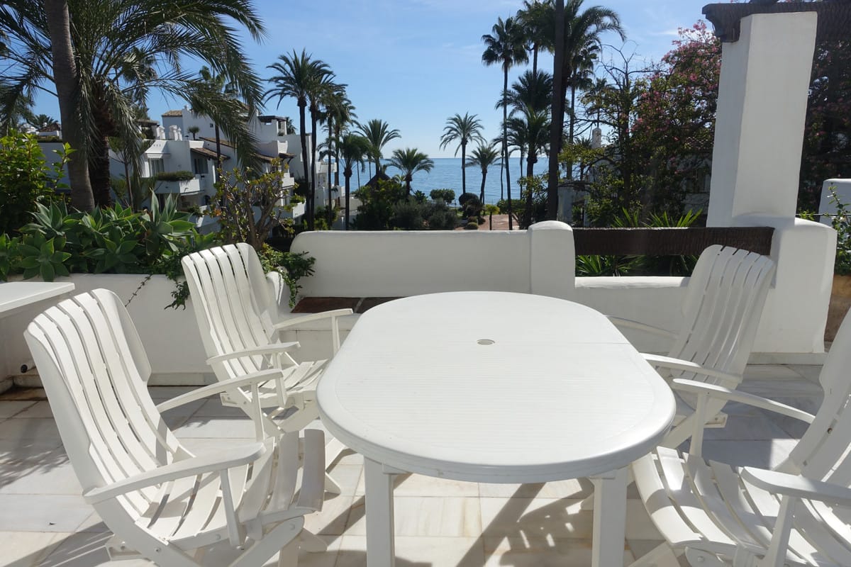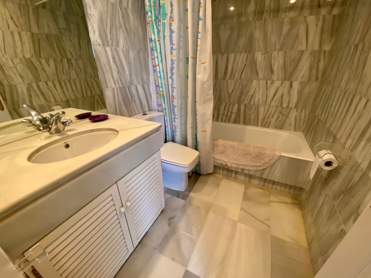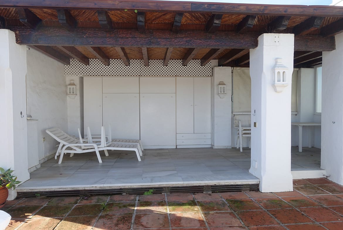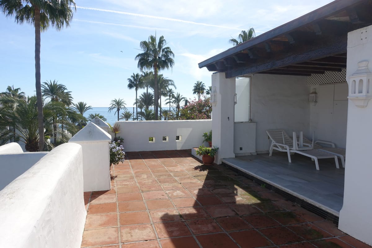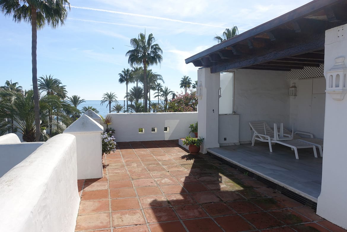 This front line beach complex is located in the New Golden Mile, whithin walking distance to all amenities proving great installations such as: 7 pools, paddle, tennis and basketball courts, gym, a football field and a beach restaurant. It has a beautiful beach as well as landscaped tropical gardens. The penthouse comprises of 2 bedrooms, 2 bathrooms, kitchen with utility room, good sized living / dining area with access to a west facing terrace offering nice sea, pool and garden views. The huge roof terrace of 100 sqm area is perfect for relaxing and enjoying the nice sunny days. Special features: air conditioning, marble flooring, 24 h security, gated complex.