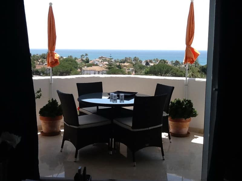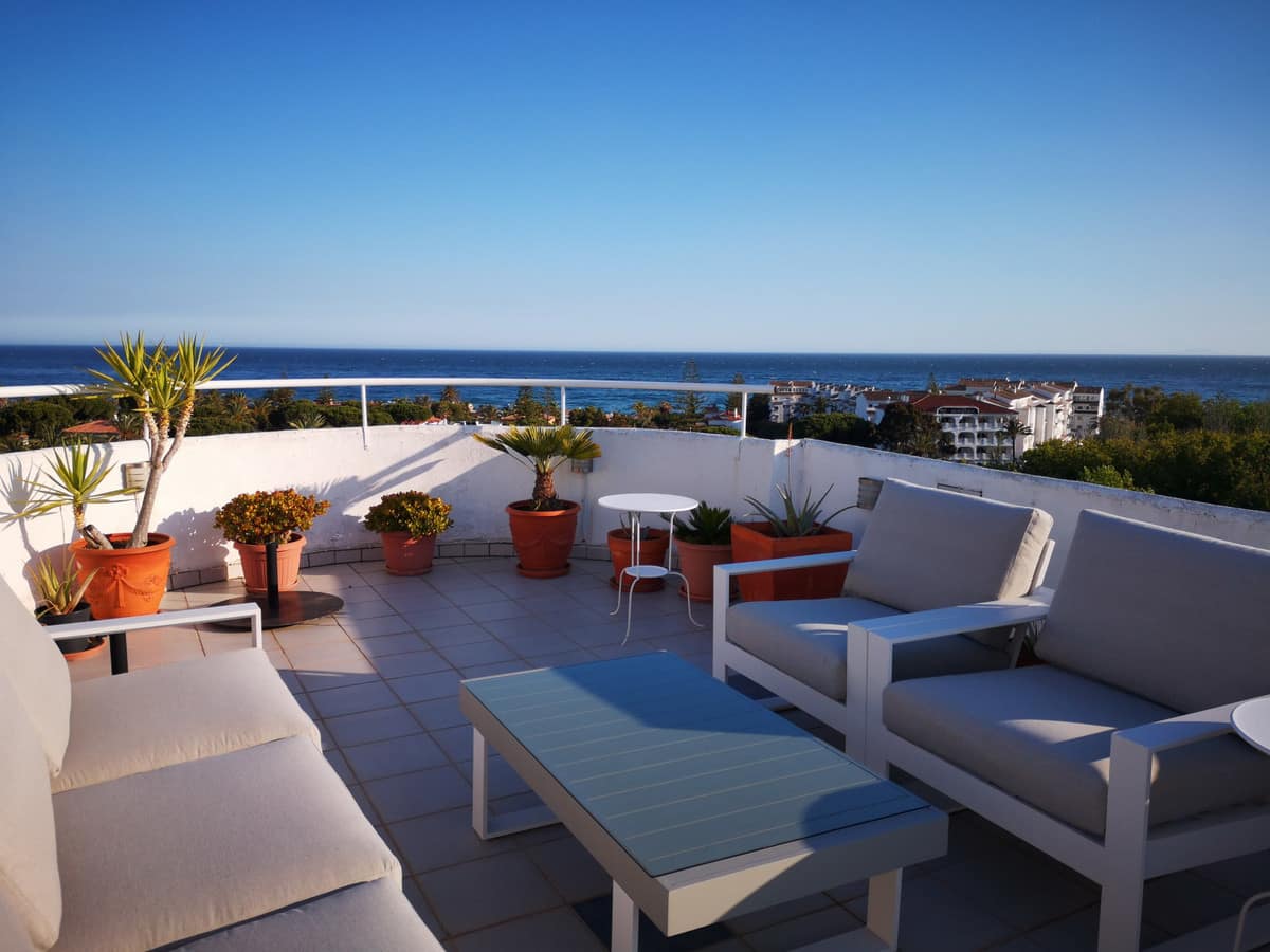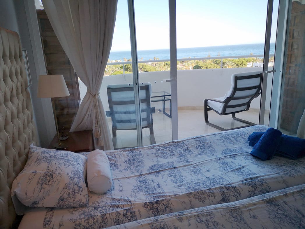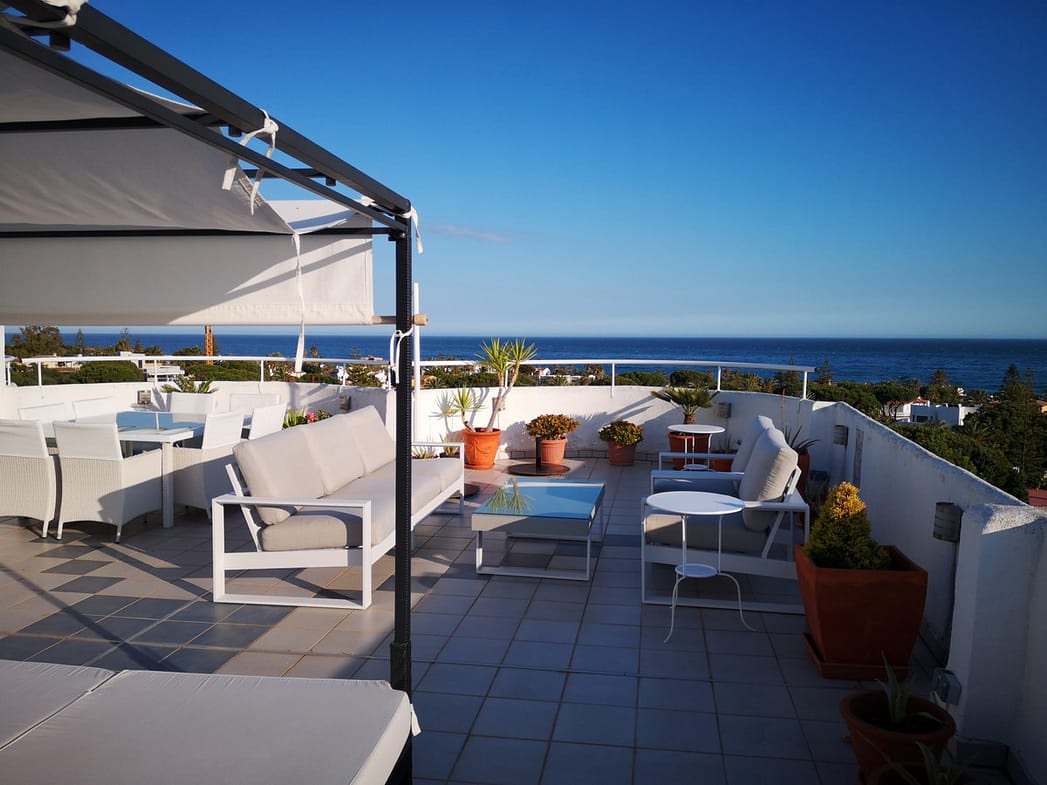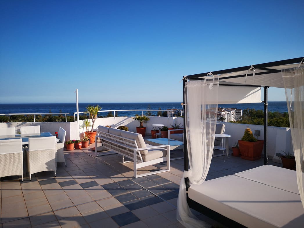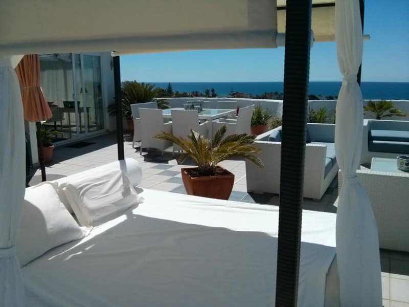 2 Bedroom apartment for holiday rental in Marbesa: This is a wonderful 2 bedroom penthouse with the most amazing huge terrace where you can laze around on a balinesian style chill out bed, looking out to the sparkling Mediterranean. Every detail has been thought of in this perfect holiday home. There are 2 bathrooms, both with large showers, and both bedrooms have twin beds which can be pushed together. The state of the art kitchen is completely equipped with hob, oven, microwave, toaster, coffeemaker, Nespresso machine, juicer, dishwasher, fridge freezer and all appliances are either Bosch or Miele. The glassware and crockery is of the best quality and no detail has been missed. The highlight of this penthouse is the terrace where you will find a dining table and chairs, sofas and armchairs as well as a large double chill out bed, parasols and a proper overhead shower when you need to cool off. This apartment is suitable for over 18s only.