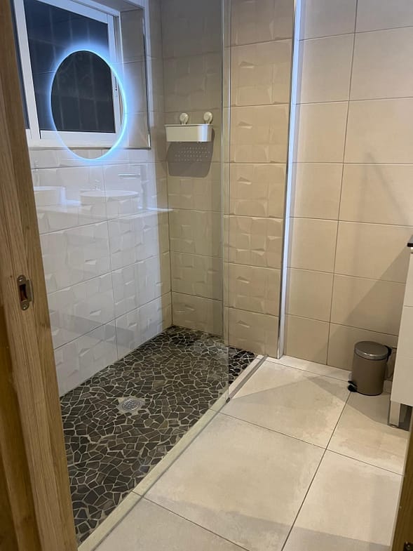 Bathroom: 1 modern bathroom with double sinks and a spacious walk-in shower.