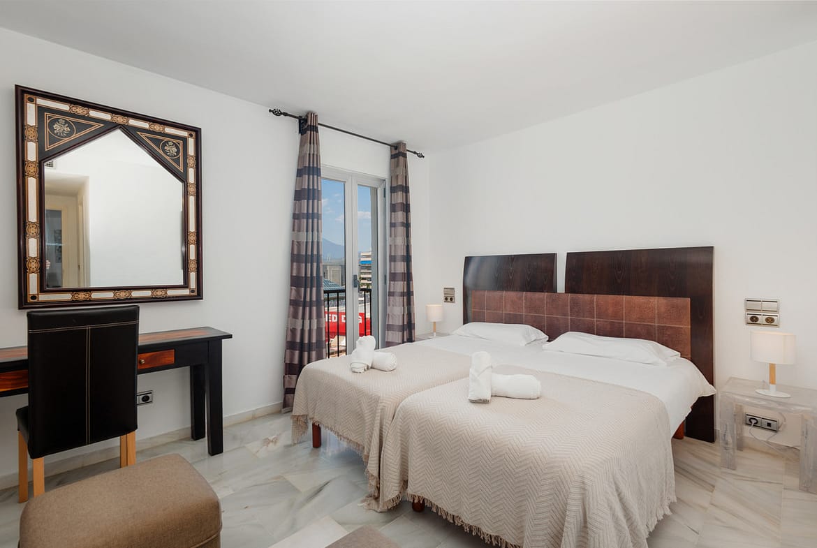 The master bedroom, en-suite, features a comfortable double bed, a large private bathroom with a whirlpool bathtub, separate shower, sink, toilet, and access to a private terrace. The second bedroom, also en-suite, has two single beds, a balcony overlooking Plaza Antonio Banderas, and a full bathroom with a bathtub.